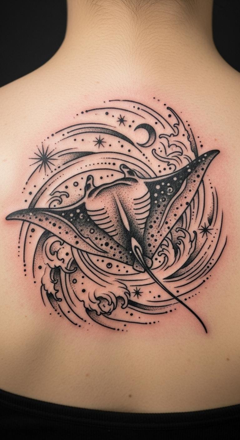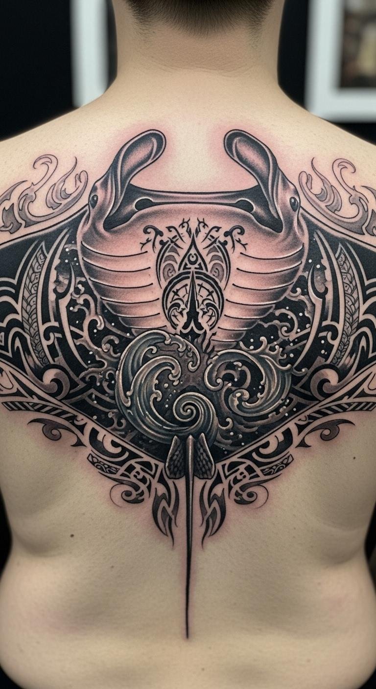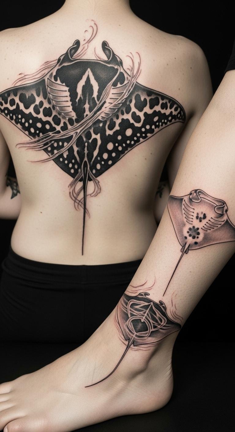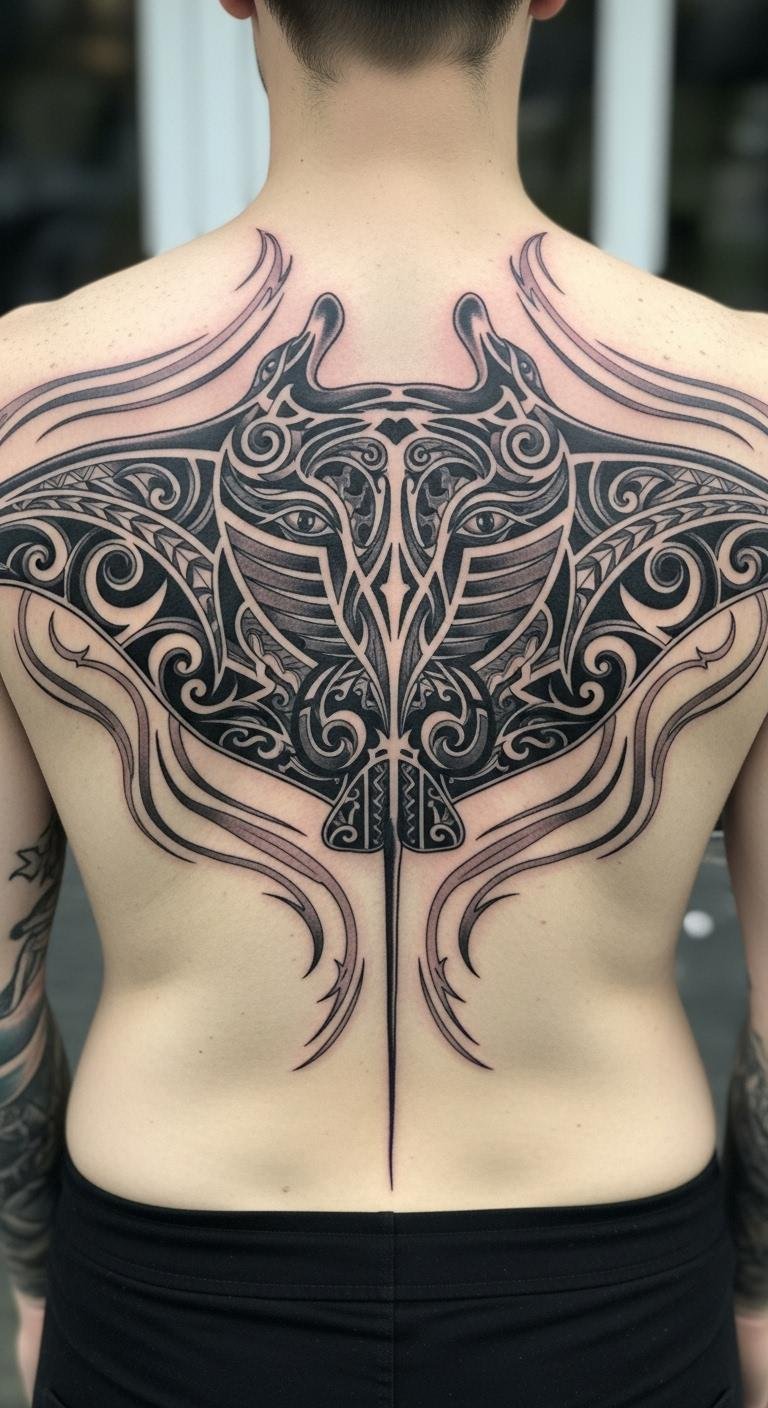 Back manta ray tattoos act as personal guardians with wide designs. They cover space to show resilience. Sketch large ideas on paper first. Use online tutorials for free guidance. Look for artists with package deals. Incorporate simple elements like stars cheaply. Focus on symmetrical shapes for balance. This placement hides or shows as you like. Get basic outlines done in one session. End with ink that feels empowering.