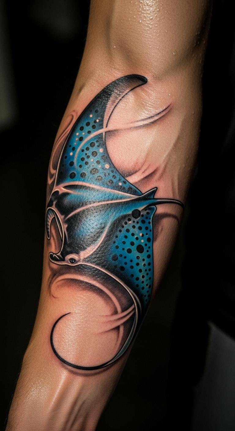 Forearm manta ray tattoos emphasize movement with easy curves. Place them for daily visibility. Start by drawing on your arm with washable ink. Use free design apps on your phone. Find artists at local events for lower prices. Add water swirls for extra flair. Opt for basic black ink to cut costs. Test with temporary tattoos first. This idea makes your ink feel alive and practical. Keep the design simple for quick sessions.