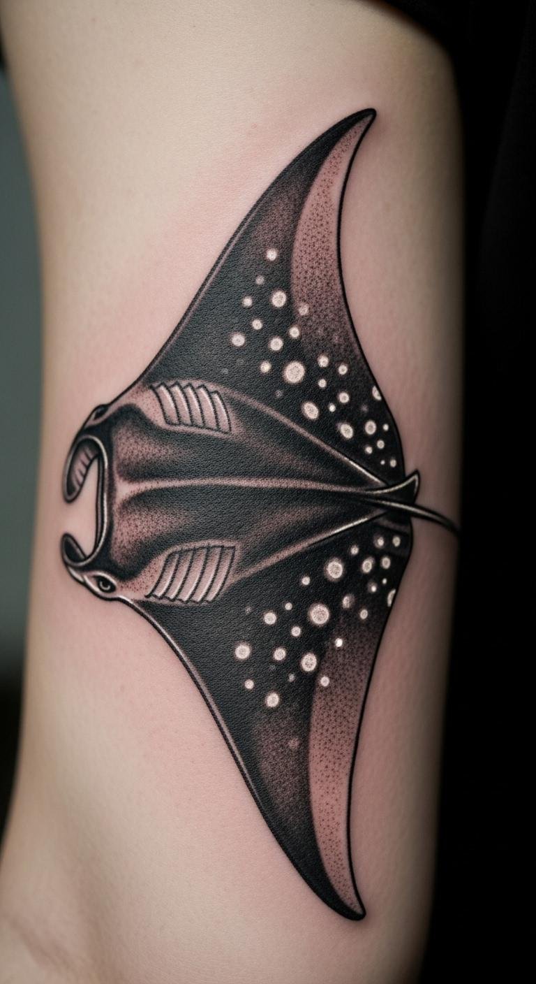 White spots in manta ray tattoos bring clarity to the art. They highlight key areas subtly. Add them with simple shading techniques. Practice on paper with white pens. Look for low-cost sessions at studios. This detail enhances without extra cost. Use phone filters to preview. Your tattoo will stand out easily.