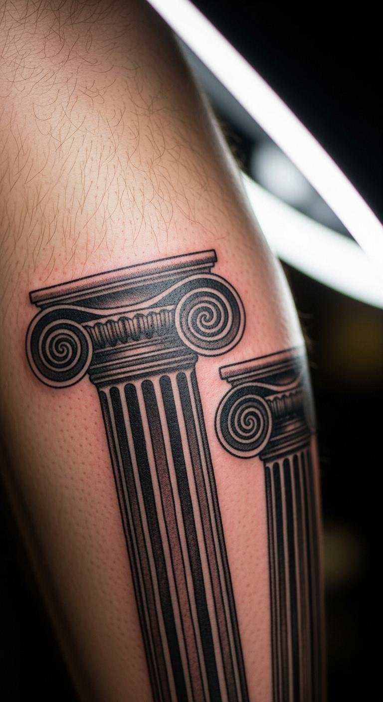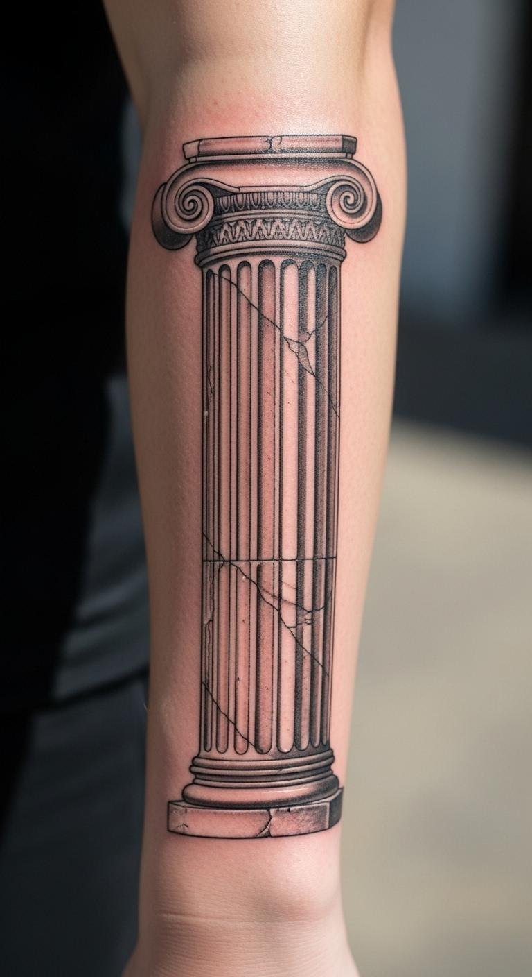 Think of a Doric column on your arm. It shows order. This tattoo adds strength. Draw columns yourself. Use online pics. Get it for $60. Opt for straight lines. Include a base. Place on your bicep. It’s easy. Test with paper. Use as a pillar. Chat about history. Customize now.