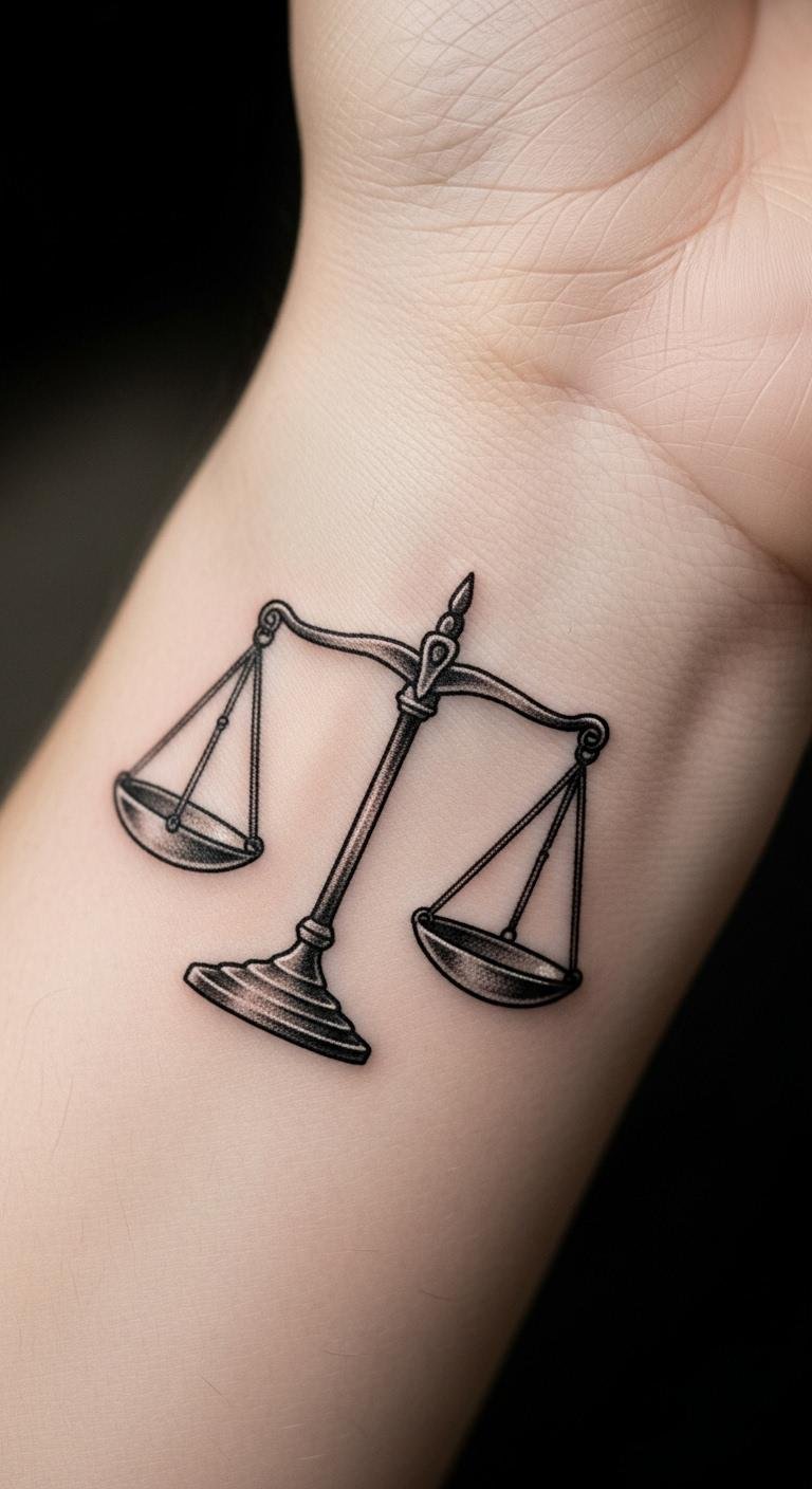 Picture scales on your wrist. It stands for ethics. This design promotes fairness. Sketch balances fast. Find justice art. Ink for $40. Use even lines. Add weights. Place visibly. It’s clear. Practice at home. Let it guide. Share ethics. Build simply.