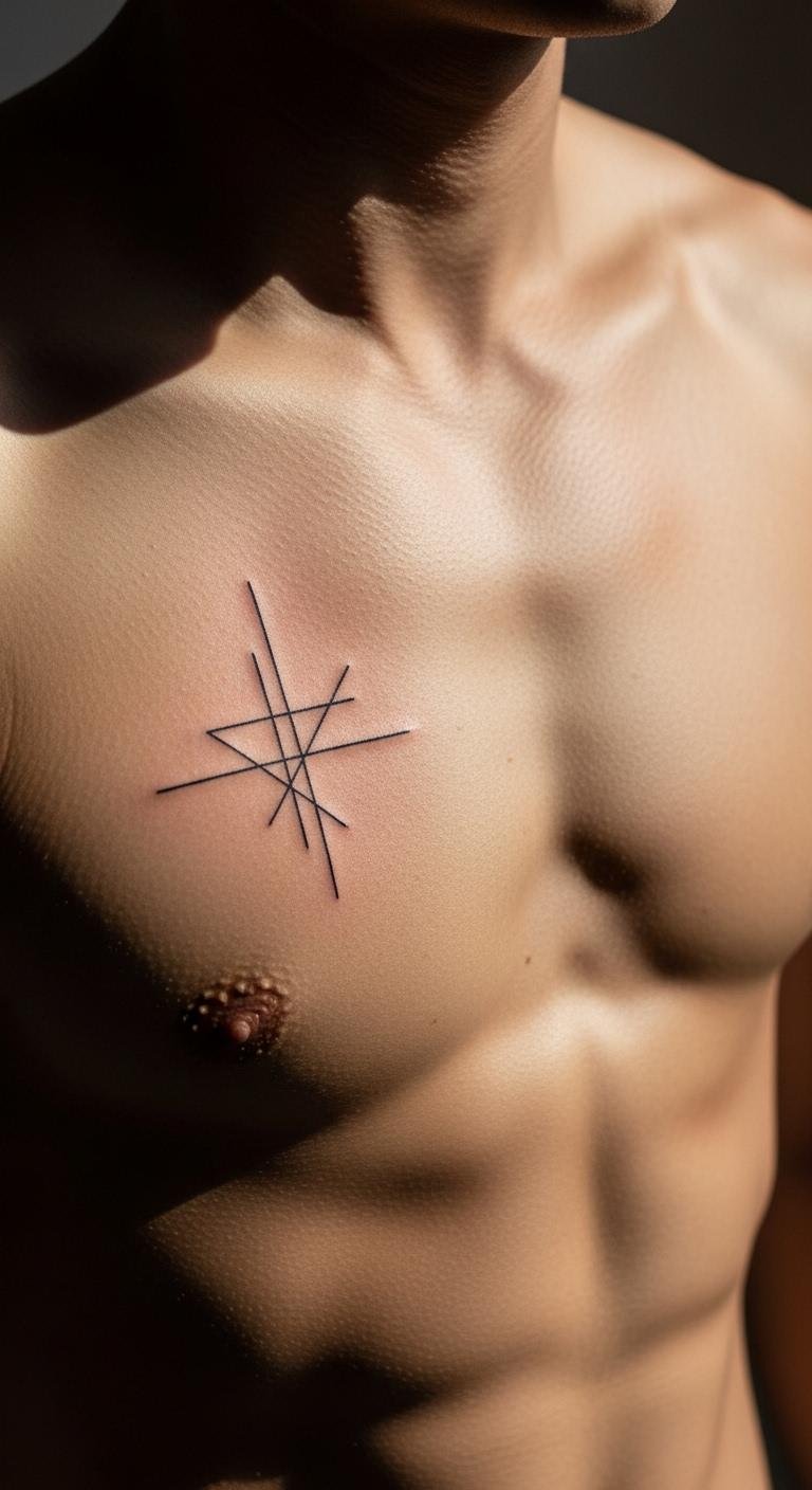 Think about starting with simple lines that form shapes like triangles or squares. This design keeps things easy and clean on your chest. Pick a spot near your collarbone for a subtle effect. To keep costs low, sketch the idea yourself using a phone app before visiting a shop. Aim for black ink only to save money. Break it down: draw a few lines on paper first, then adjust for your body. This helps you avoid extra sessions. Get a basic tattoo kit online if you’re practicing, but always go to a pro for the real thing. Focus on placement to highlight your build. Try this: use a mirror to test different spots at home. It makes the process fun and stress-free.