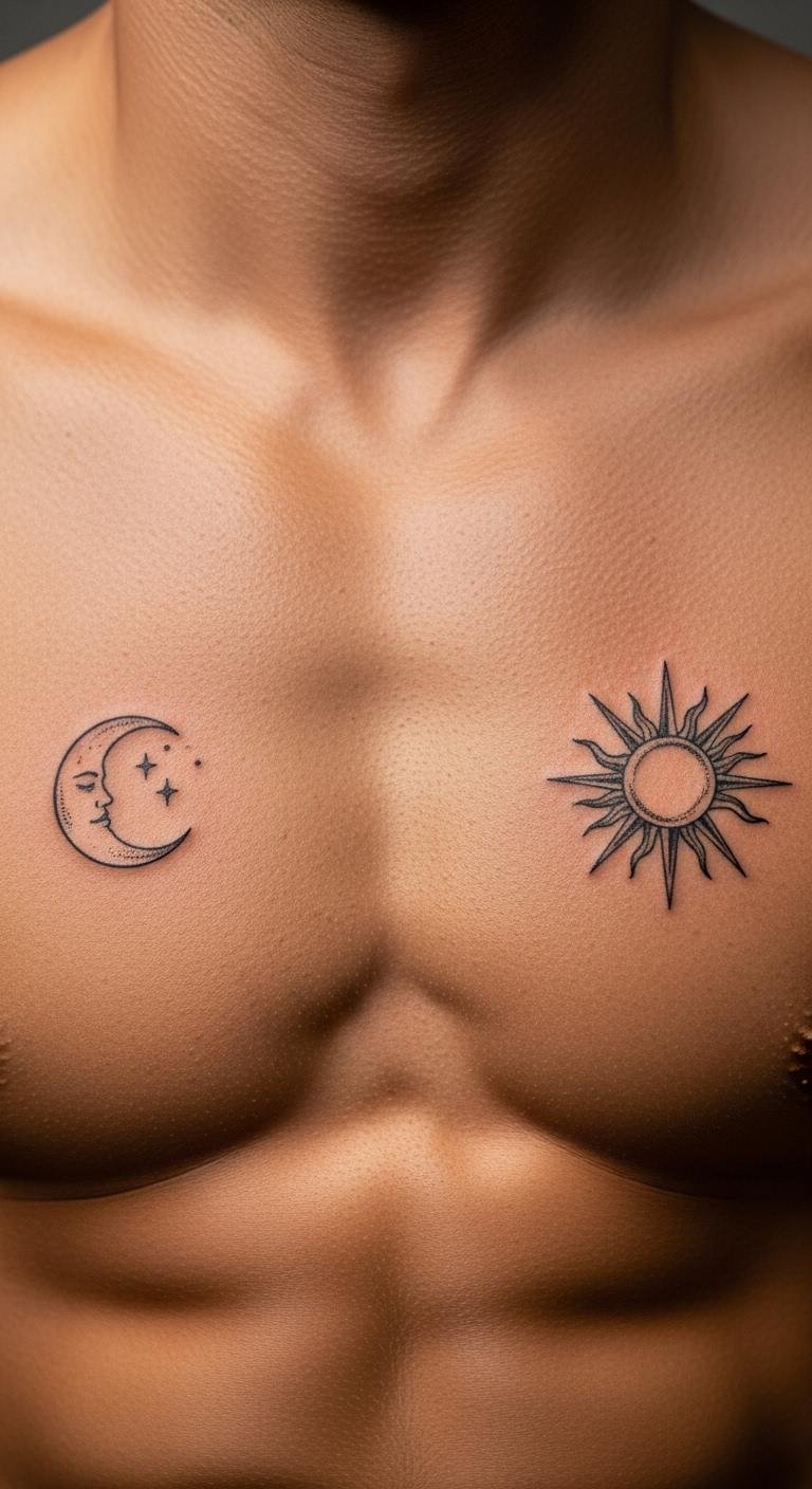 Sun and moon show balance in a small tattoo. Use minimal elements for a cheap choice. Align it with your chest curve. Design on paper at home for free. This step refines your idea. Go for a quick session with few colors. Use simple care routines.