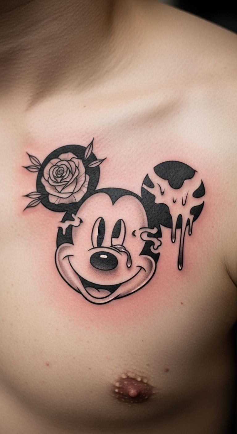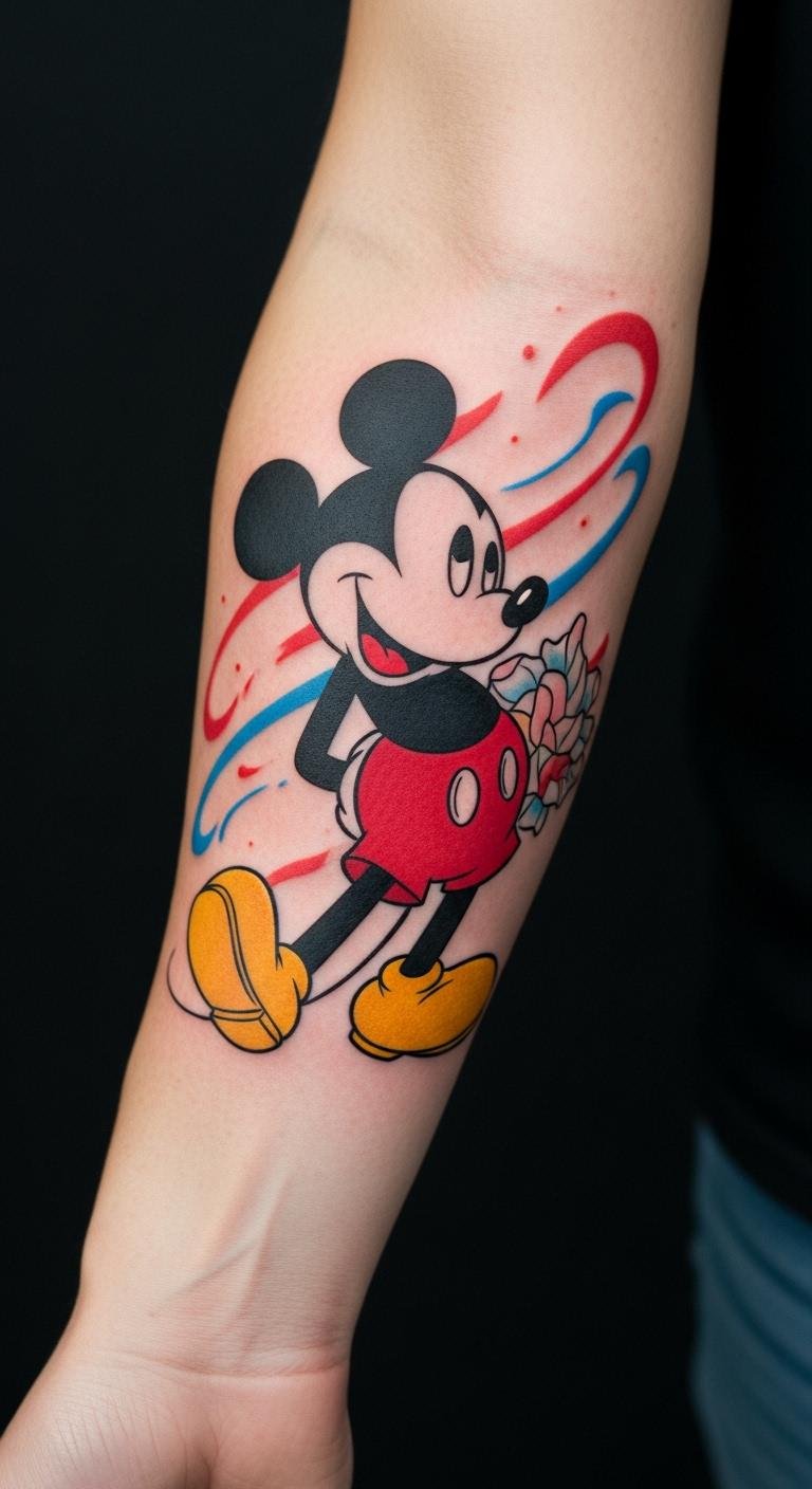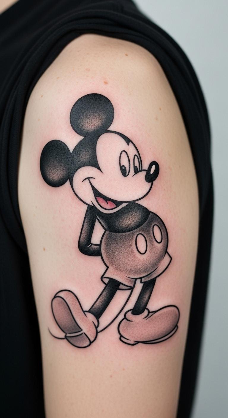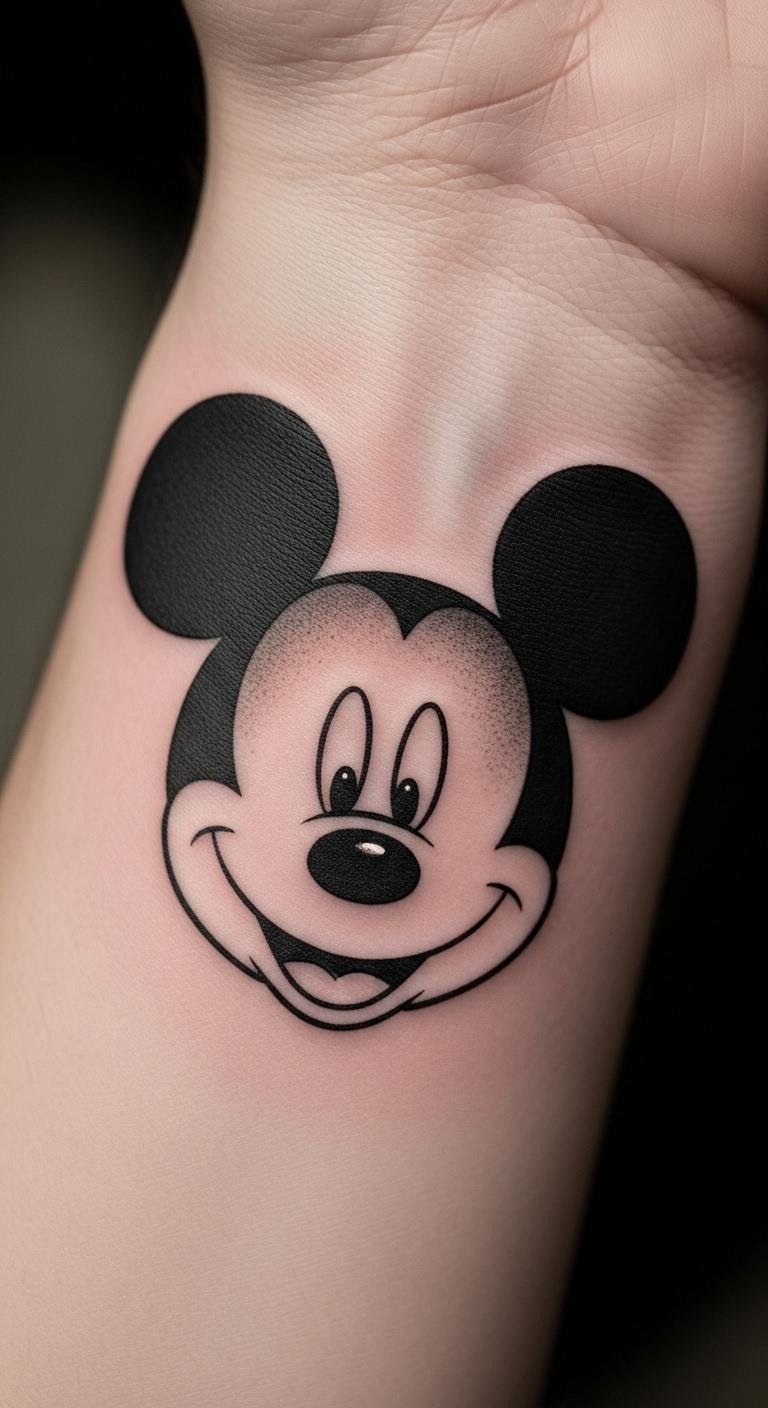 Picture Mickey as a 1920s tough guy in a suit. This design plays with innocence and edge. Put it on your forearm for impact. Draw a simple version on paper with markers. Add elements like a hat yourself. It keeps things budget-friendly. For instance, watch free videos on drawing cartoon figures. Mix in personal symbols like a date. Talk to local shops for quotes. This style tells a story without breaking the bank. Choose black and grey to save on color.