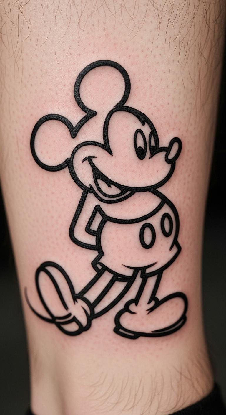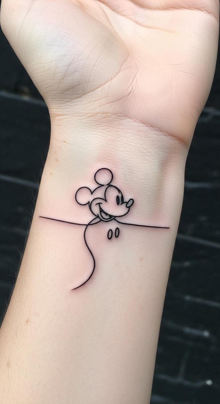 Go for a clean, modern look with a single line Mickey. It’s one smooth stroke for his face. This style fits small spots. You save money by keeping it simple. Sketch it freehand on your arm with a marker. Find templates online and trace them. Choose a spot like your ankle for easy hiding. For instance, practice drawing circles and curves on paper. Add personal touches like a tiny star. It means innocence in a subtle way. Talk to friends who have ink for tips. This helps you decide without rushing.
