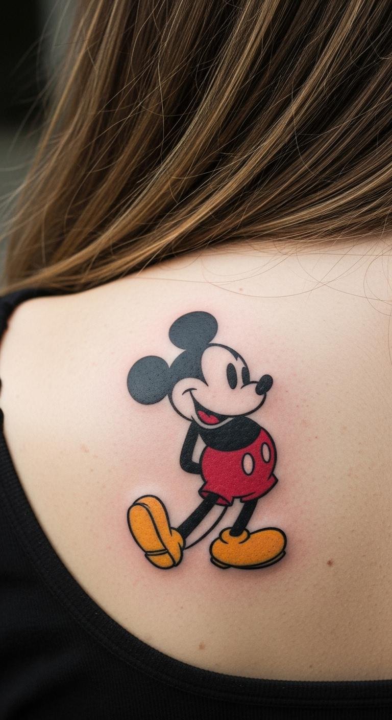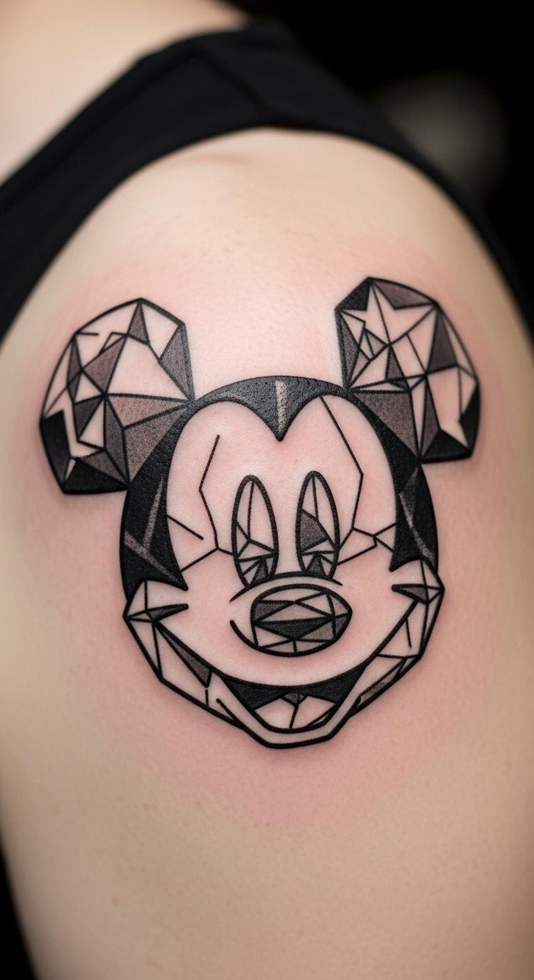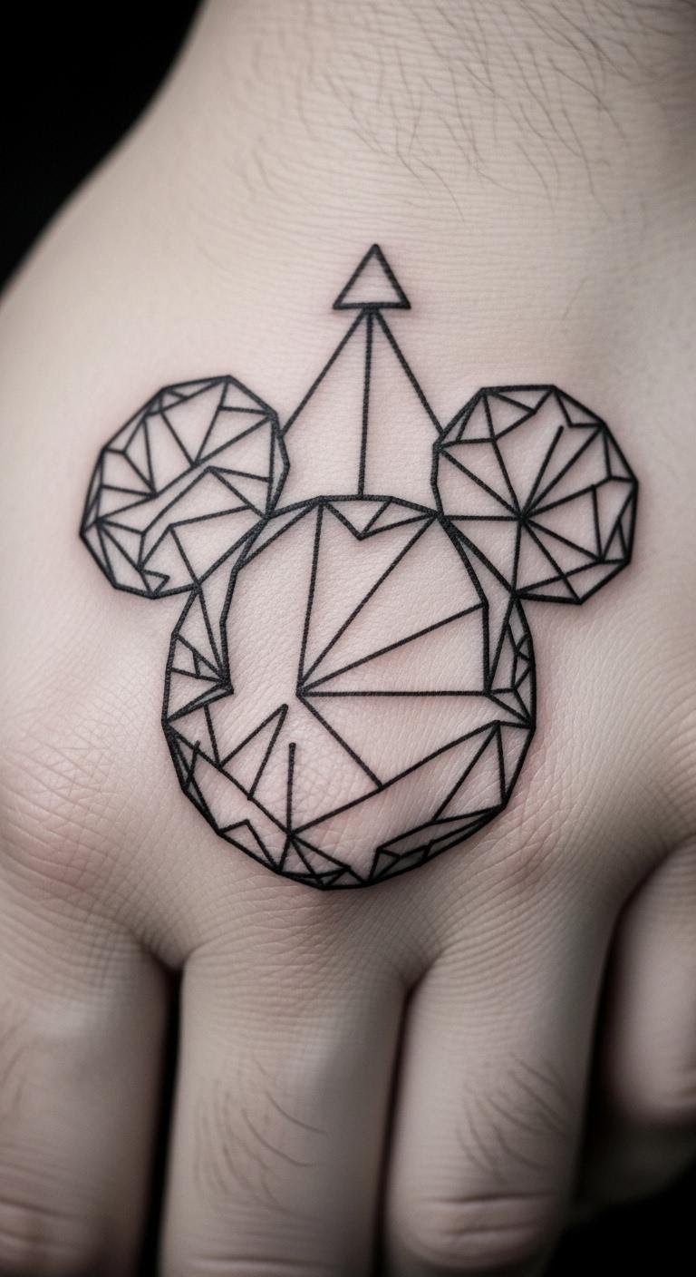 Mix shapes like triangles for a geometric Mickey. It gives a fresh, sophisticated edge. Place it on your back for balance. Use cheap graph paper to plan your design. Draw basic shapes and combine them. This costs less than complex art. For example, use a ruler and pencil at home to mimic the look. Experiment with symmetry. It symbolizes fun with a twist. Find affordable artists online who specialize in this. Keep it small to cut expenses. You’ll love how it blends old and new.
