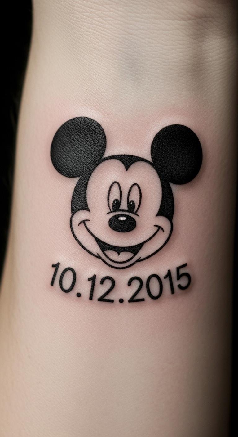 Add a date to Mickey for a personal touch. Use your wrist. Sketch the number next to him. Do it with a pen first. For example, write dates on paper designs. Incorporate birthdays. This is budget-friendly. Find free customization tools online. It makes the tattoo unique.