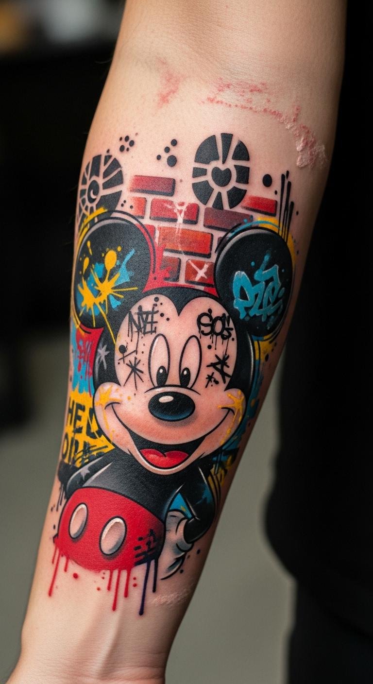 Give Mickey an urban edge with street vibes. Place it on your forearm. Draw graffiti-inspired sketches. Use markers for practice. For example, add spray can effects on paper. Blend in city symbols. This keeps it cheap. Look for local street artists. It expresses confidence.