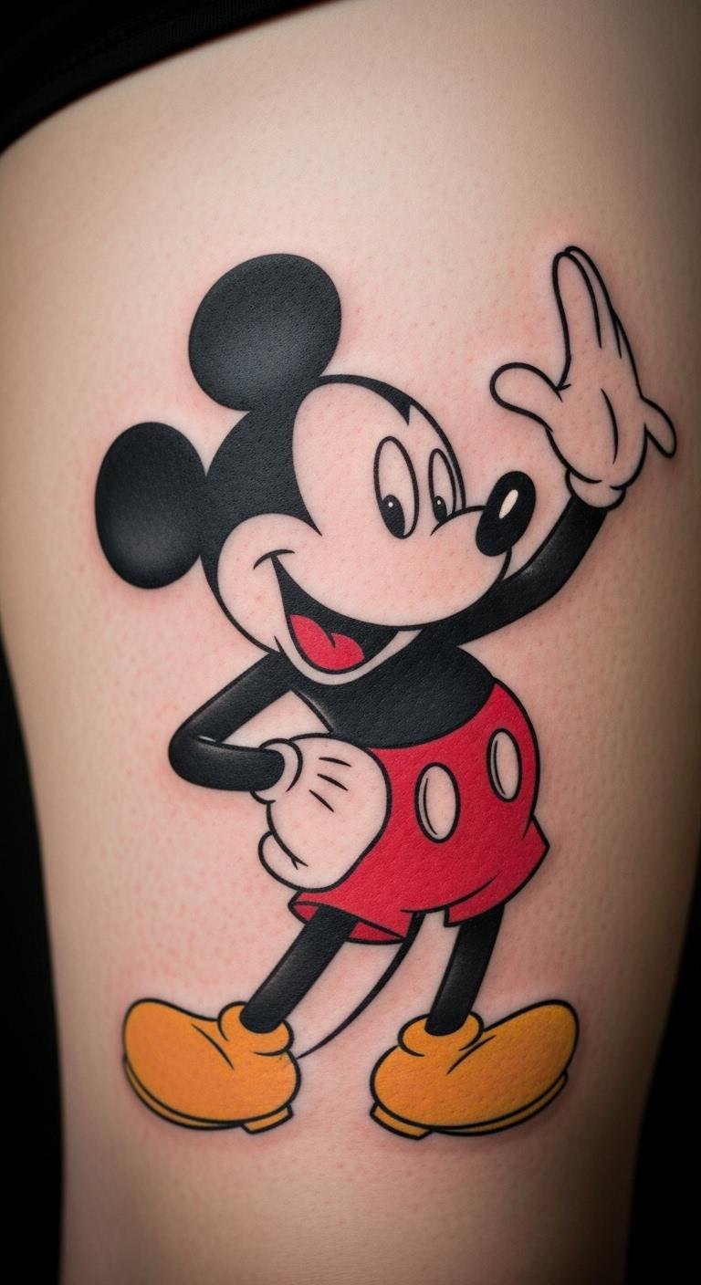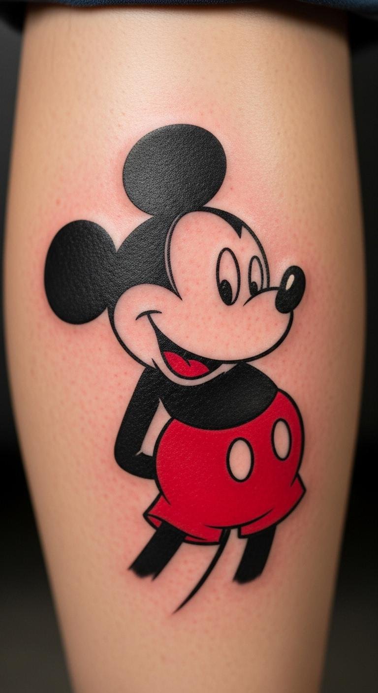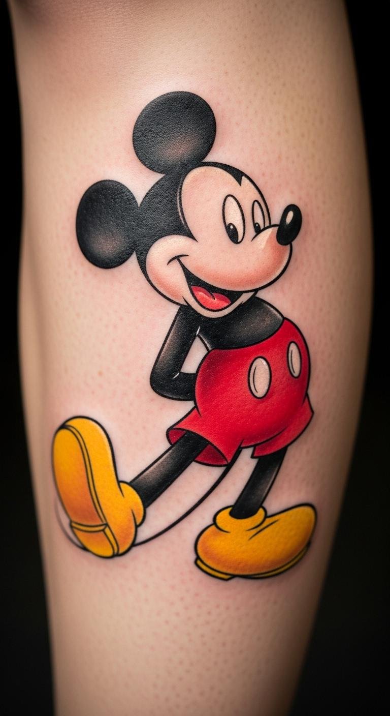 Add pops of color to Mickey for a lively twist. Try your leg for space. Experiment with markers on skin first. It’s a low-cost trial. For example, color sample designs from apps. Use primary colors for boldness. This keeps things simple. Find sales at tattoo studios. It evokes happiness easily. Choose a small area to stay budget-friendly.