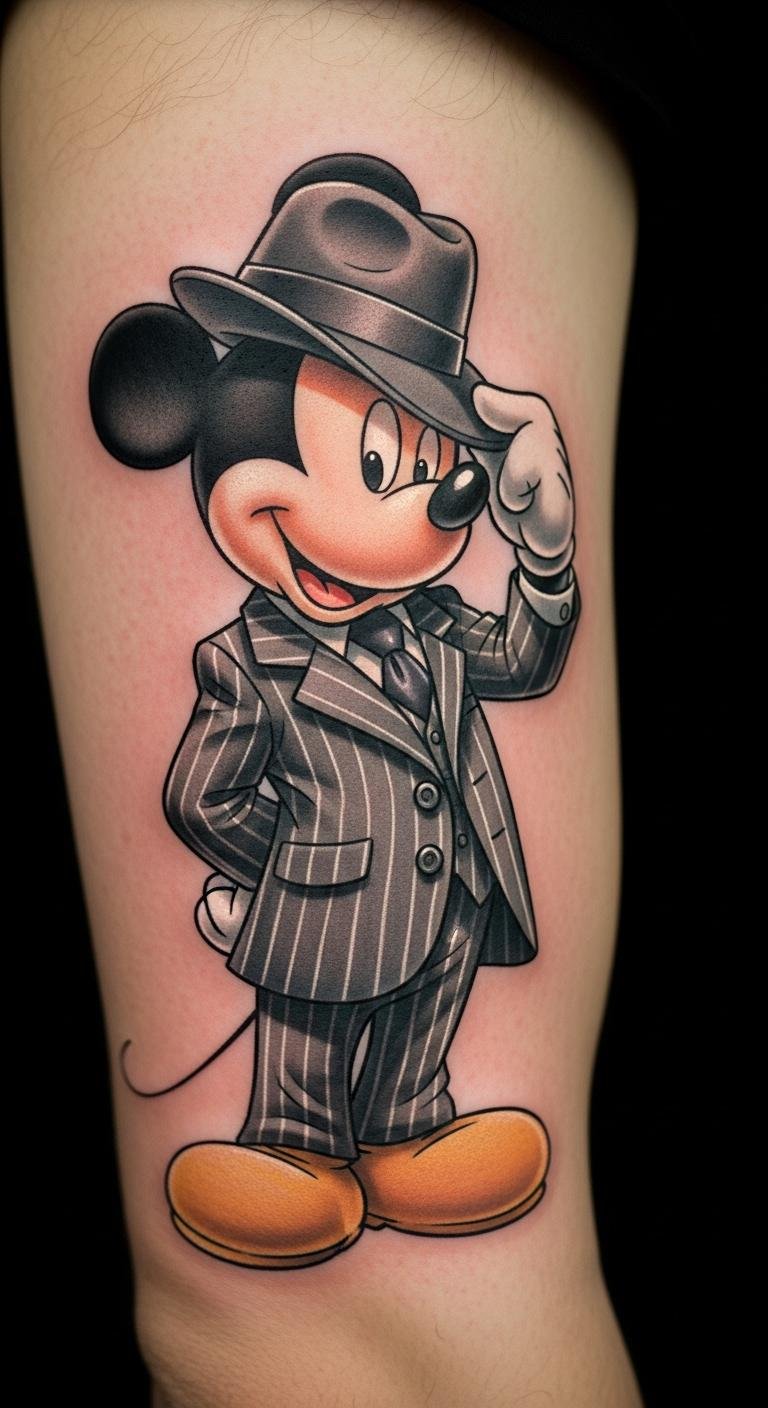 Dress Mickey in a suit for that gangster nod. Put it on your bicep. Draw the outfit simply. Use pencils for details. For example, add stripes with lines. Incorporate suit elements. Keep it black and white. Find deals online. It adds narrative.