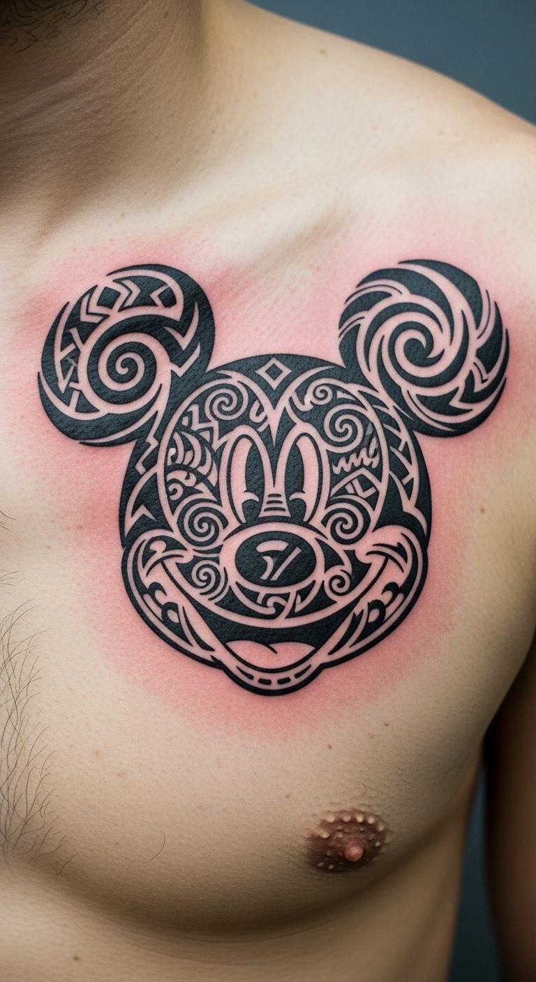 Combine tribal patterns with Mickey for a cultural mix. Place it on your chest for heritage feel. Draw patterns on paper using free guides. Mix in simple lines yourself. For instance, add dots and swirls with a marker. Incorporate family symbols. This makes it affordable. Look for artists in your area who do fusions. It connects past and present. Go for black ink to cut costs.