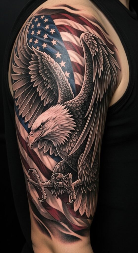Combine flag and eagle for a powerful mix. Place it on your arm for visibility. Draw combos on paper quickly. Access free design sites for help. Keep it medium-sized for savings. Use mixed inks from stores. This one inspires daily. Protect during healing with cheap wraps. Customize with your twist.