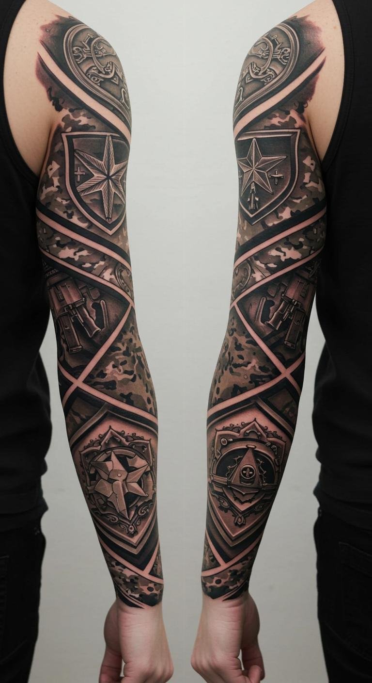 A military sleeve builds a full story. Start on your upper arm and expand. Plan with sketches in a notebook. Use online resources for free ideas. Break it into phases for cost control. Pick basic inks for each part. This design covers for work easily. Maintain with household products. Add elements over time.