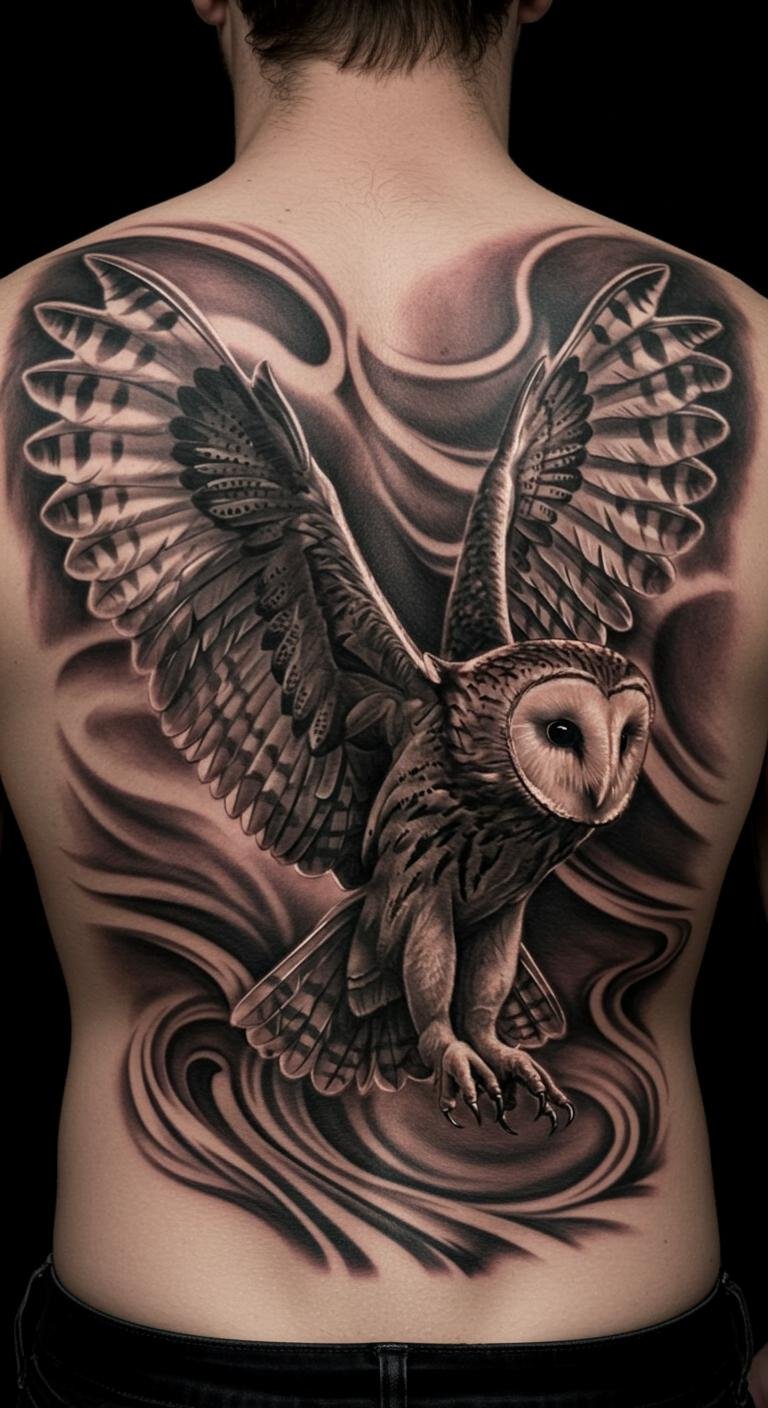 Owl in flight shows vigilance. On back. Sketch flights. Online aids. Cost-effective. Simple healing. Add flair.