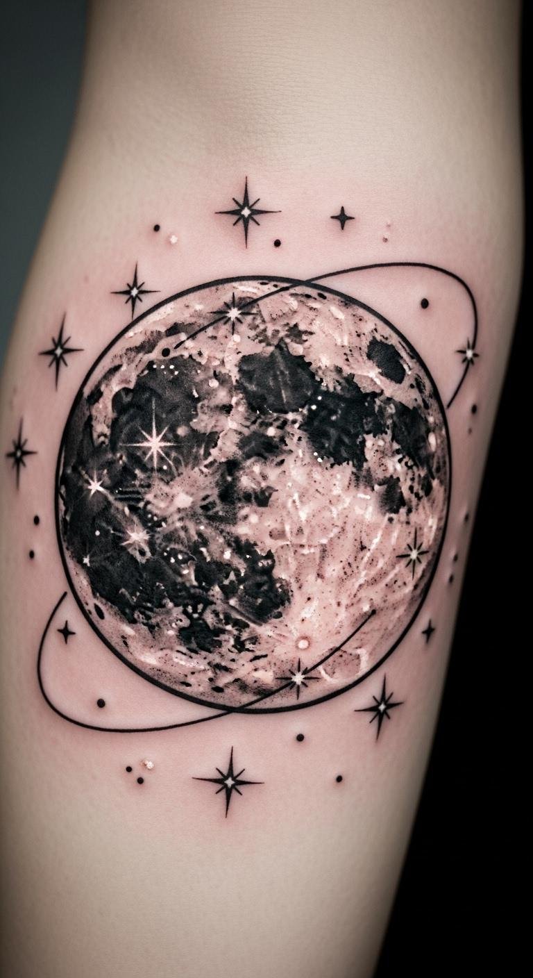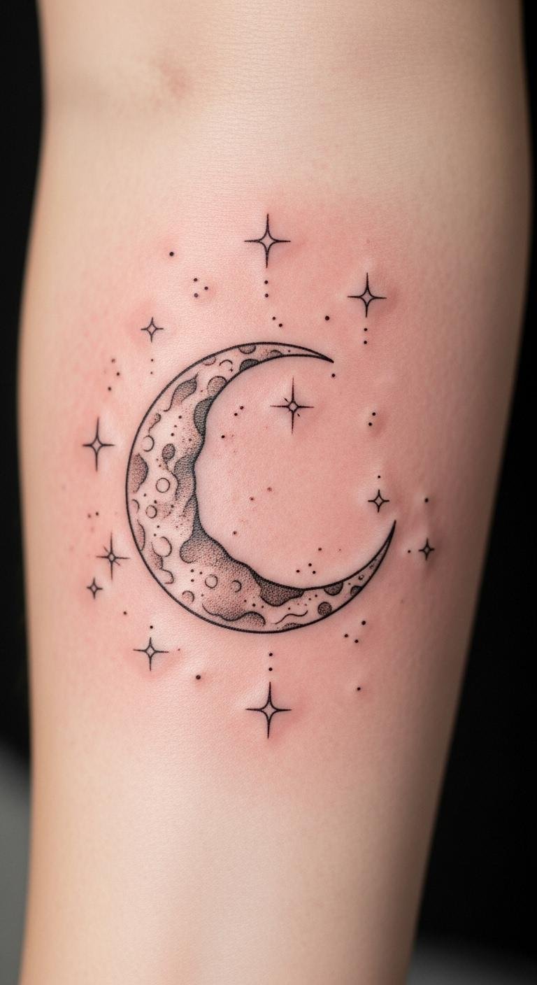 Surround your moon with stars for fullness. Plot dots on paper. Forearm shows it off. Low-cost ink, $110. Use star charts online. Make it symmetrical. Draw temporarily. Go for efficient artists. This builds a galaxy effect.