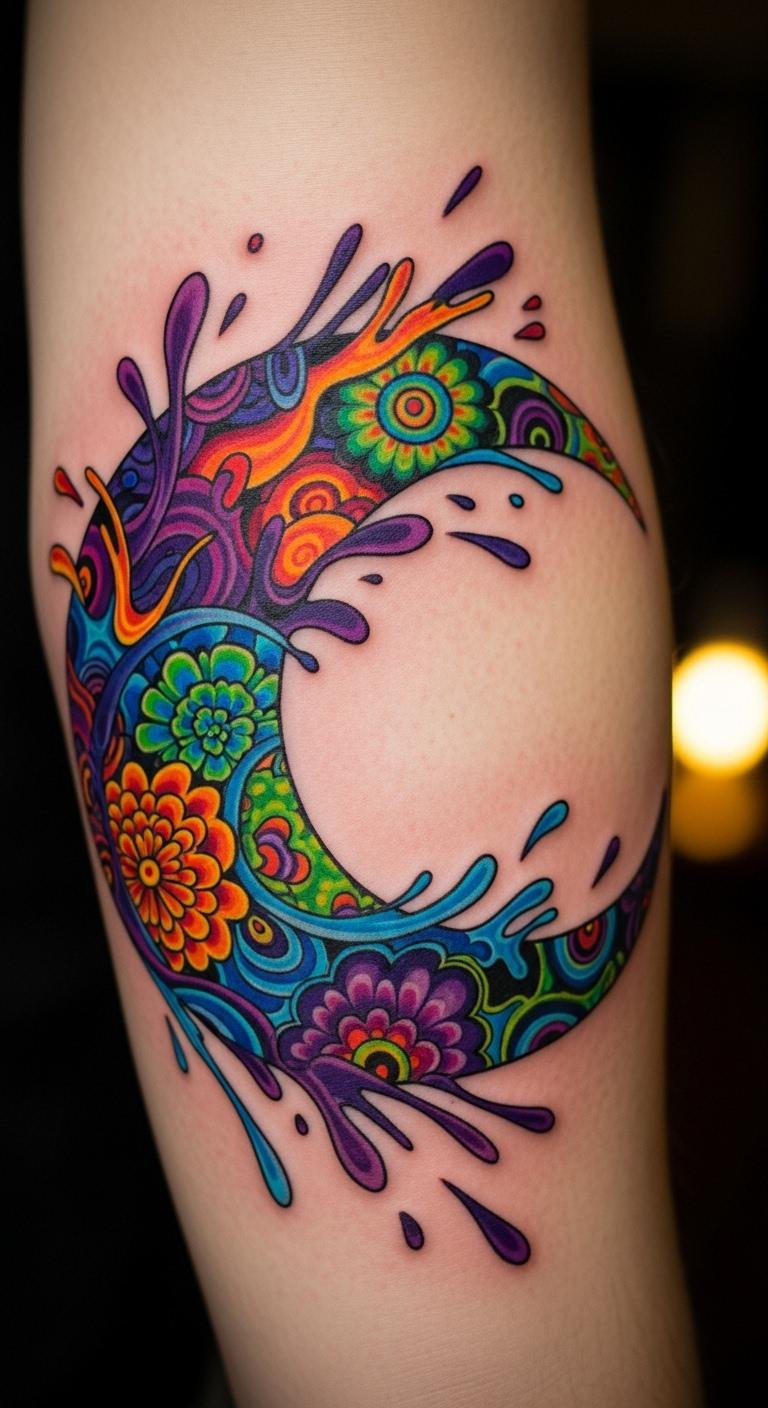 Swirl colors for a psychedelic moon vibe. Doodle waves around the moon. Put it on your arm for visibility. Limit colors for budget, about $200. Watch free videos on swirl techniques. Add your own twists. Practice on canvas paper. Find a creative artist deal. This brings energy to your skin.