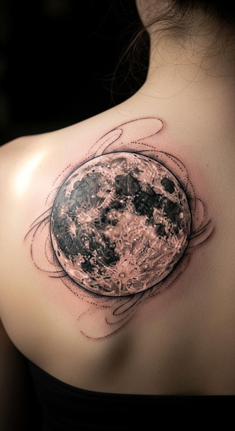 A full moon on your thigh offers space for creativity. Sketch a big circle. Thigh hides easily. Affordable ink at $160. Modify online images. Add patterns inside. Practice on large paper. Find thigh experts. This design feels empowering.