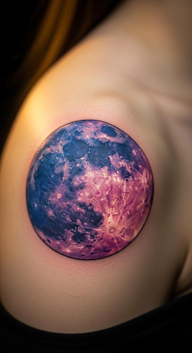 Use gradients for a colorful moon. Blend shades in your sketch. Shoulder displays well. Two colors keep it at $190. Learn from free guides. Personalize the fade. Test on fabric. Select color-savvy pros. This adds modern flair.