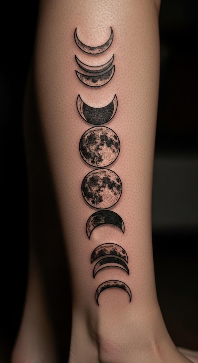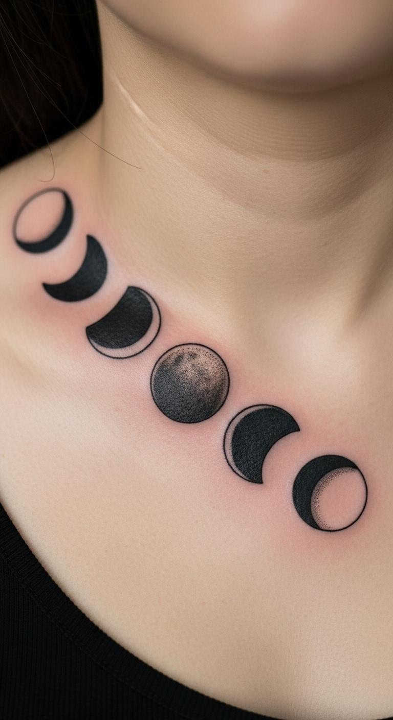 Line up moon phases for a story of change. Draw a row of circles on paper, varying the shapes. Place them along your collarbone for a flowing look. Black ink means lower costs, around $120. Download free phase templates to adapt. Add a twist, like your initials. Test with a temporary tattoo kit. Find artists who do linear styles affordably. This design tracks personal growth. Keep it straight and simple.