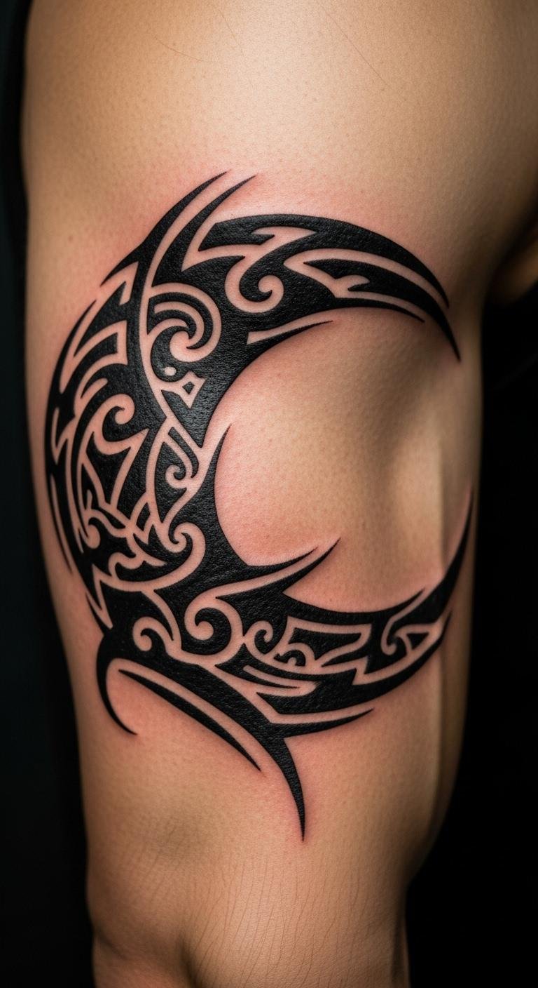 Add tribal edges to your moon. Draw bold lines. Bicep shows strength. Basic ink, $170. Adapt tribal art free. Make it cultural. Practice bold strokes. Choose pattern artists. This adds edge and meaning.