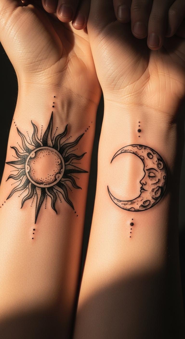 Pair a sun with a moon for a balanced vibe. Perfect for friends or partners. Draw two shapes side by side on paper—a circle for the sun and a crescent for the moon. Keep them small for matching sets. Put them on your forearms for daily visibility. Go with basic black ink to keep it affordable, often under $200 for both. Use free apps to design your own version before the appointment. Add a small line to connect them, symbolizing unity. Pick an artist from local reviews who does quick sessions. This makes a great shared experience. Test the idea by drawing it temporarily with henna. You’ll love how it tells a story.