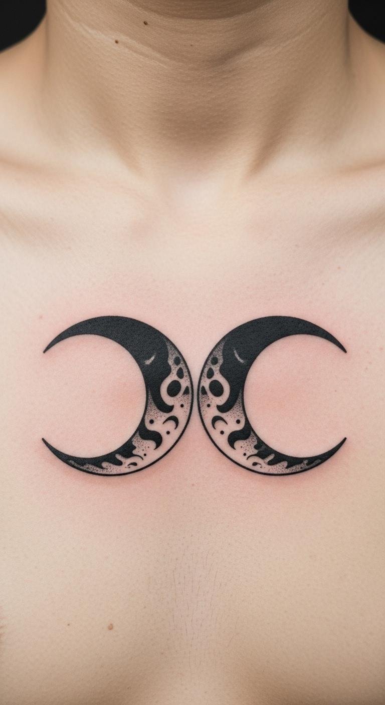Mirror two moons for symmetry. Draw pairs. Chest for impact. Ink around $210. Mirror designs online. Make them equal. Test symmetry. Choose balanced artists. This symbolizes duality.