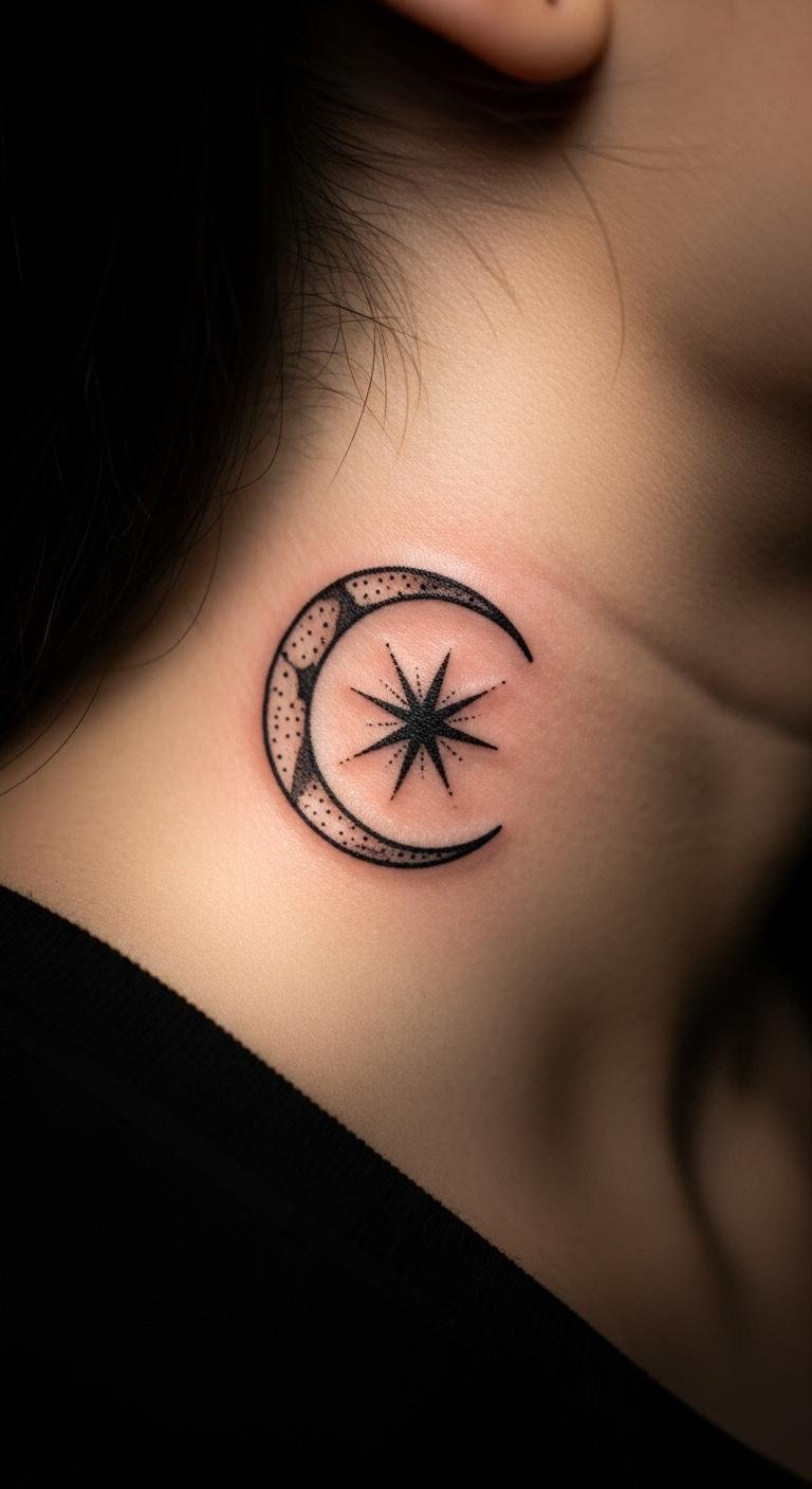 Put a star inside a tiny moon. Sketch small. Neck for subtlety. Low cost, $80. Star inside free. Add glow. Use tiny tools. Quick neck pros. This is charming.