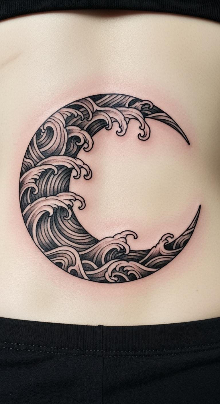 Wrap waves around the moon. Draw curves. Lower back hides easy. Ink for $190. Wave from sea art. Personalize waves. Practice curving. Find wave specialists. This adds motion.