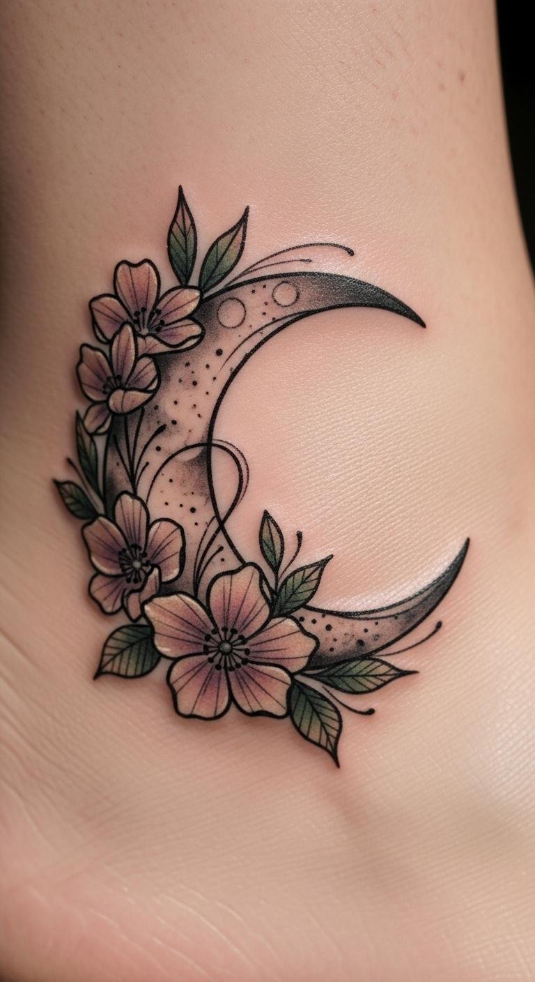 Add flowers to a moon for a soft, feminine touch. Draw a moon and sketch simple blooms around it. Use colored pencils for your home sketch. Put it on your ankle for a discreet option. Stick to one or two colors to cut costs, like $100 sessions. Find free flower designs to mix in. Make it unique by choosing your favorite bloom. Try drawing it on with eyeliner first for a trial run. Chat with affordable local artists about tweaks. This design highlights grace and strength. Keep lines clean for easy upkeep.