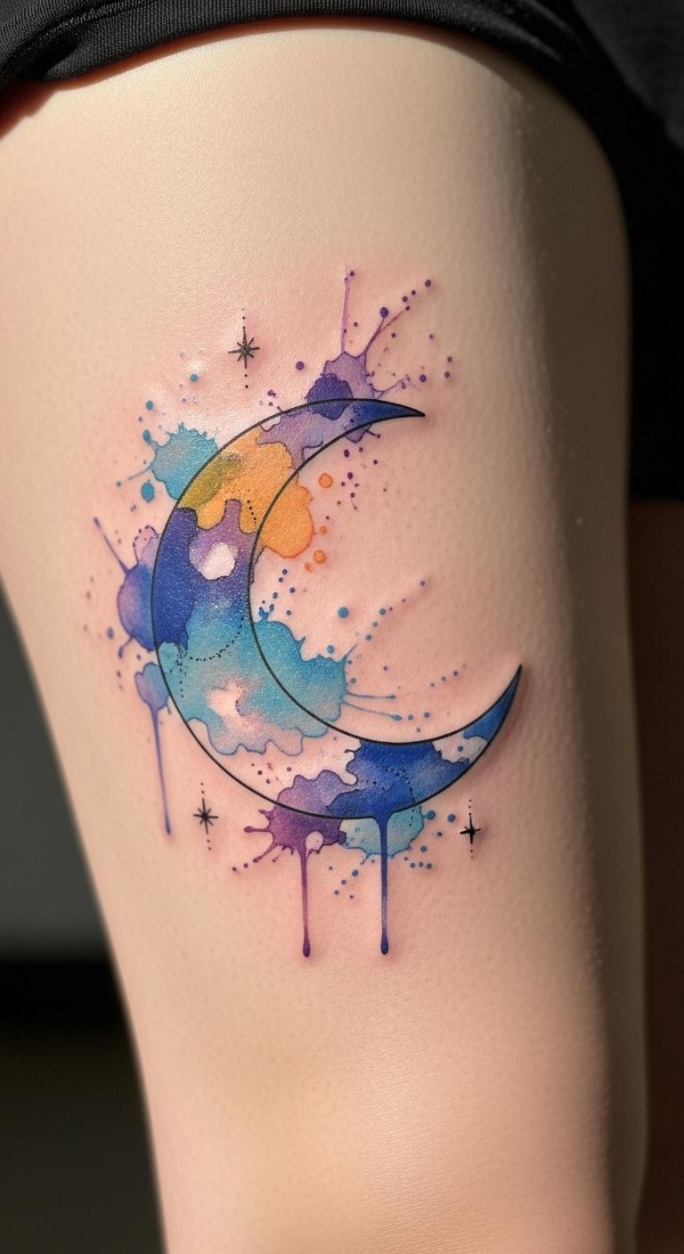 Try a watercolor moon for a painted feel. Mix colors in your sketch with markers. Put it on your thigh for more space. Use fewer colors to save money, about $180. Look for online tutorials on watercolor effects. Make it yours with blended shades. Practice blending on paper. Choose an artist good with color on a budget. This adds a fun, artistic flair.