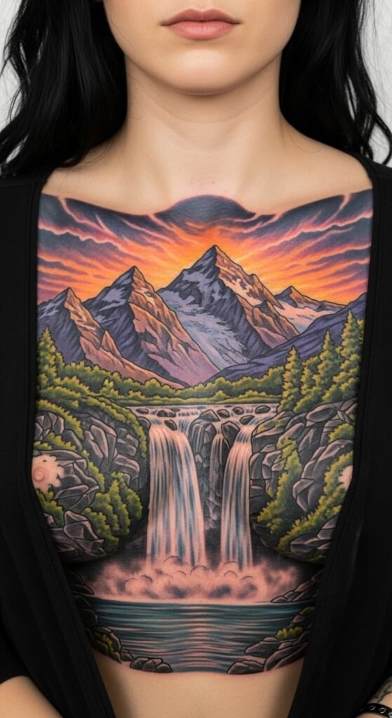 Waterfall cascades add flow to mountain tattoos, creating a dynamic scene. Picture water pouring down peaks for a fresh twist. Draw this at home with watercolors on paper to test ideas. Use free apps to mix elements like trees. Go for affordable temporary tattoos first, around $5 each, to see how it looks. Place it on your thigh for a larger canvas. Water elements bring movement. If you’re on a budget, find local artists offering deals under $100. This design tells a story of renewal. Start small and build from there.