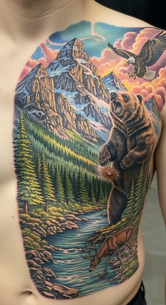 Watercolor mountains bring vibrant colors to life, like a painting on your skin. Blend shades of blue and green for depth. Practice with cheap watercolor sets on paper. Use online templates to create your own design for free. Opt for a half-sleeve spot to showcase the art. Color blends pop with minimal effort. Find budget artists through social media for sessions around $150. This style evokes nature’s beauty. Start with a small patch to test.