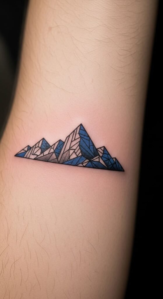 Geometric mountains use shapes for modern vibes. Draw angles. Shape designs fit small spots. Start at $40. It adds edge.