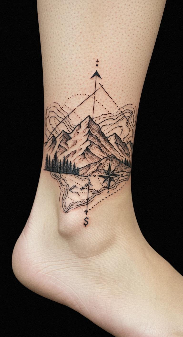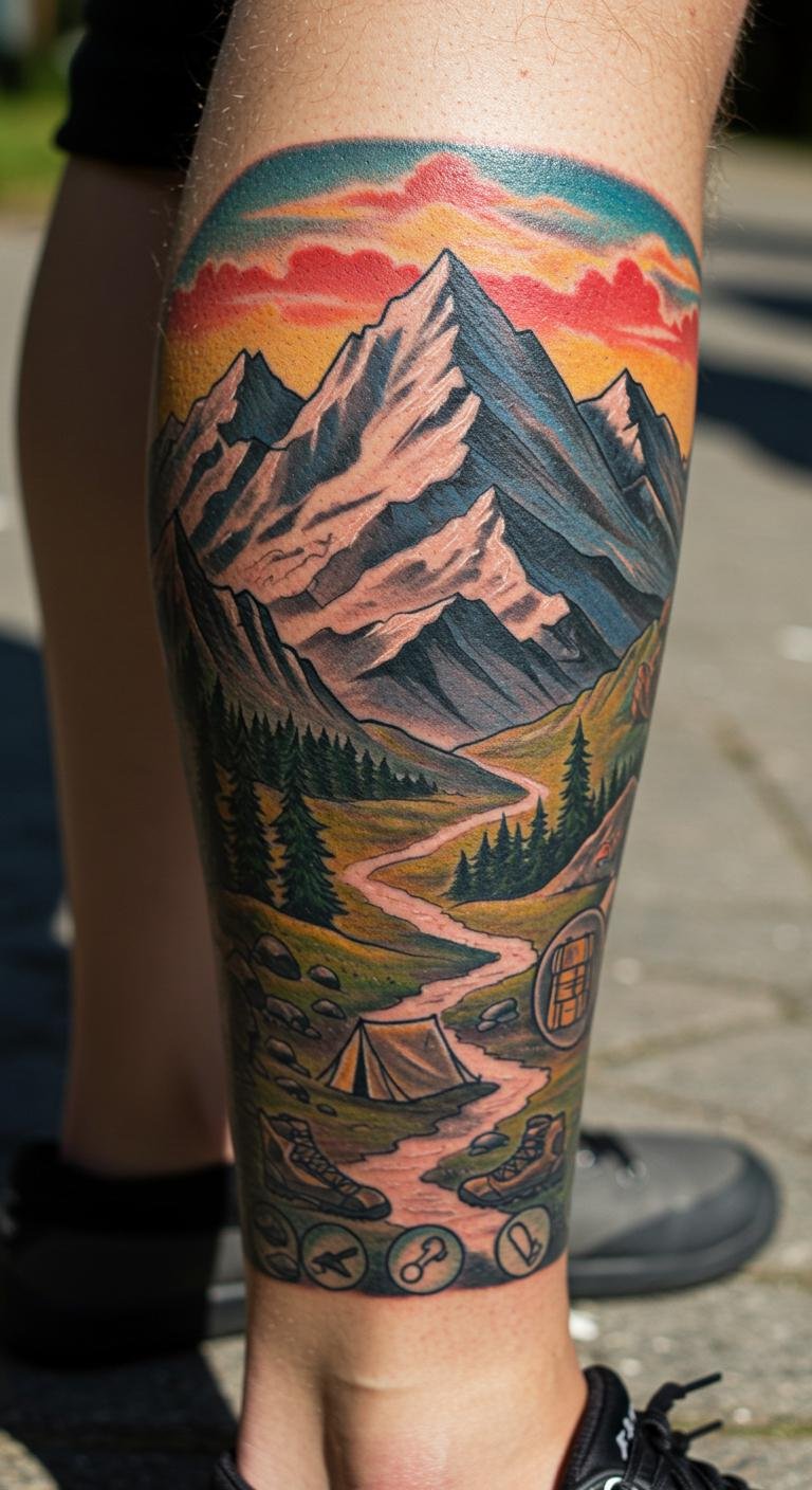 Mountain motifs for adventurers highlight paths and gear. Show trails up the peaks to represent journeys. Draw maps on paper with markers. Make a DIY version using stick-on tattoos for under $5. Put it on your calf for visibility during hikes. Gear symbols add personal flair. Seek affordable flash designs at local shops, starting at $60. It serves as a badge of exploration. Plan your design step by step.