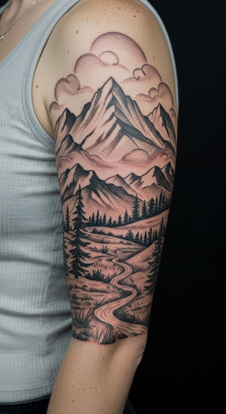 Half-sleeve narratives turn arms into adventure stories with connected peaks. Layer elements like forests around mountains. Plan on paper with basic drawing tools. Use phone apps for layout ideas at no cost. Start with a small arm band tattoo for $70. Narrative layers build over time. Choose artists with portfolio deals. It flows like a personal timeline. Add pieces one at a time.