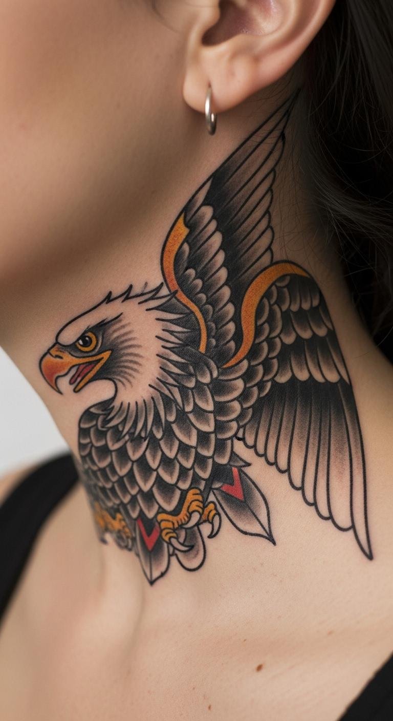 An eagle in traditional style shows pride. Pick a compact version for the neck. It carries history.