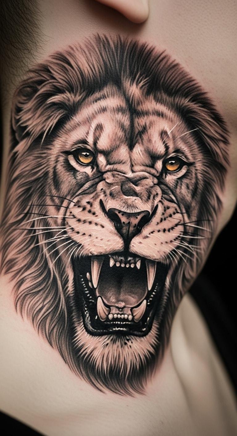 A lion face shows strength and courage. Pick a detailed yet compact design for the back of the neck. It gives off a powerful vibe.