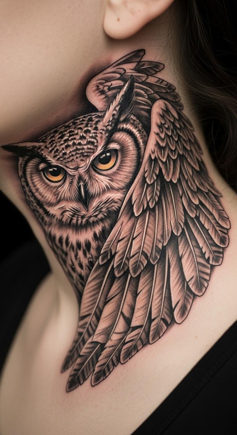 An owl in grey ink represents wisdom and mystery. Choose a small, detailed face for the neck side. It draws attention subtly.