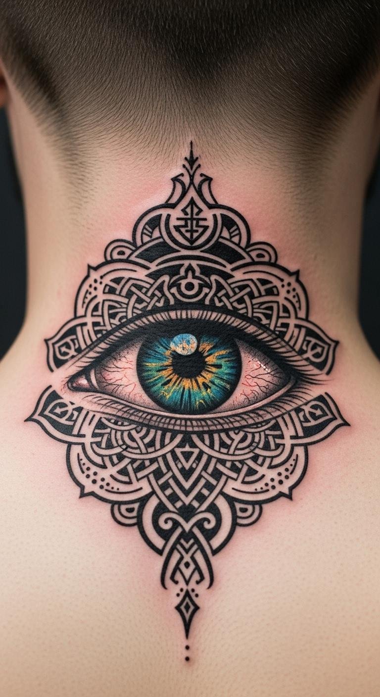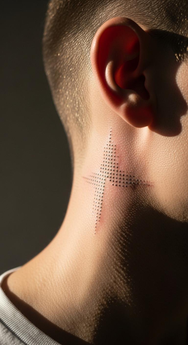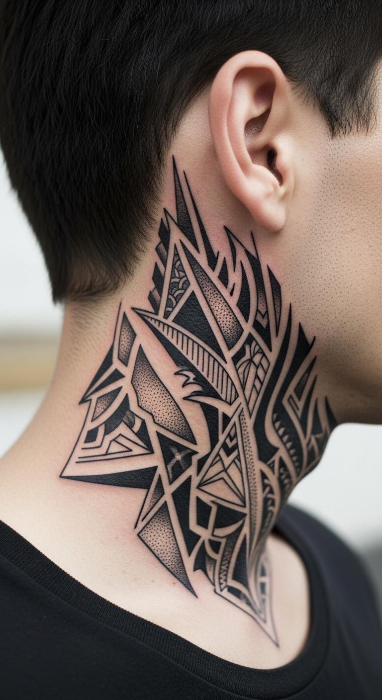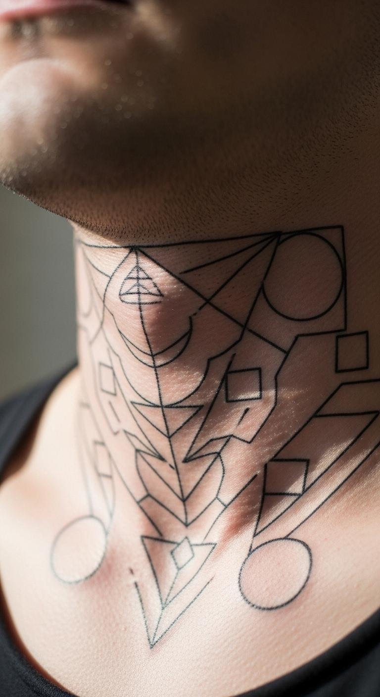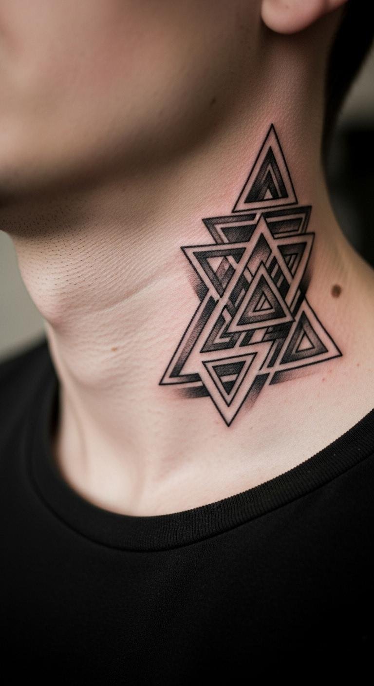 Triangles add edge to your neck with clean shapes. Start with a basic design using a ruler and paper at home. Draw a few options to see what fits. This DIY step helps avoid extra costs. Choose small sizes for less pain and quicker healing. Black ink works best and is budget-friendly. Look for artists who use simple tools; they often charge less. Place it on the back for a subtle look. Add dots for texture without complicating things. Use lotion from your bathroom to care for it later. This keeps the tattoo fresh and vibrant. Experiment with phone filters to preview colors. You’ll get a modern style that stands out easily.