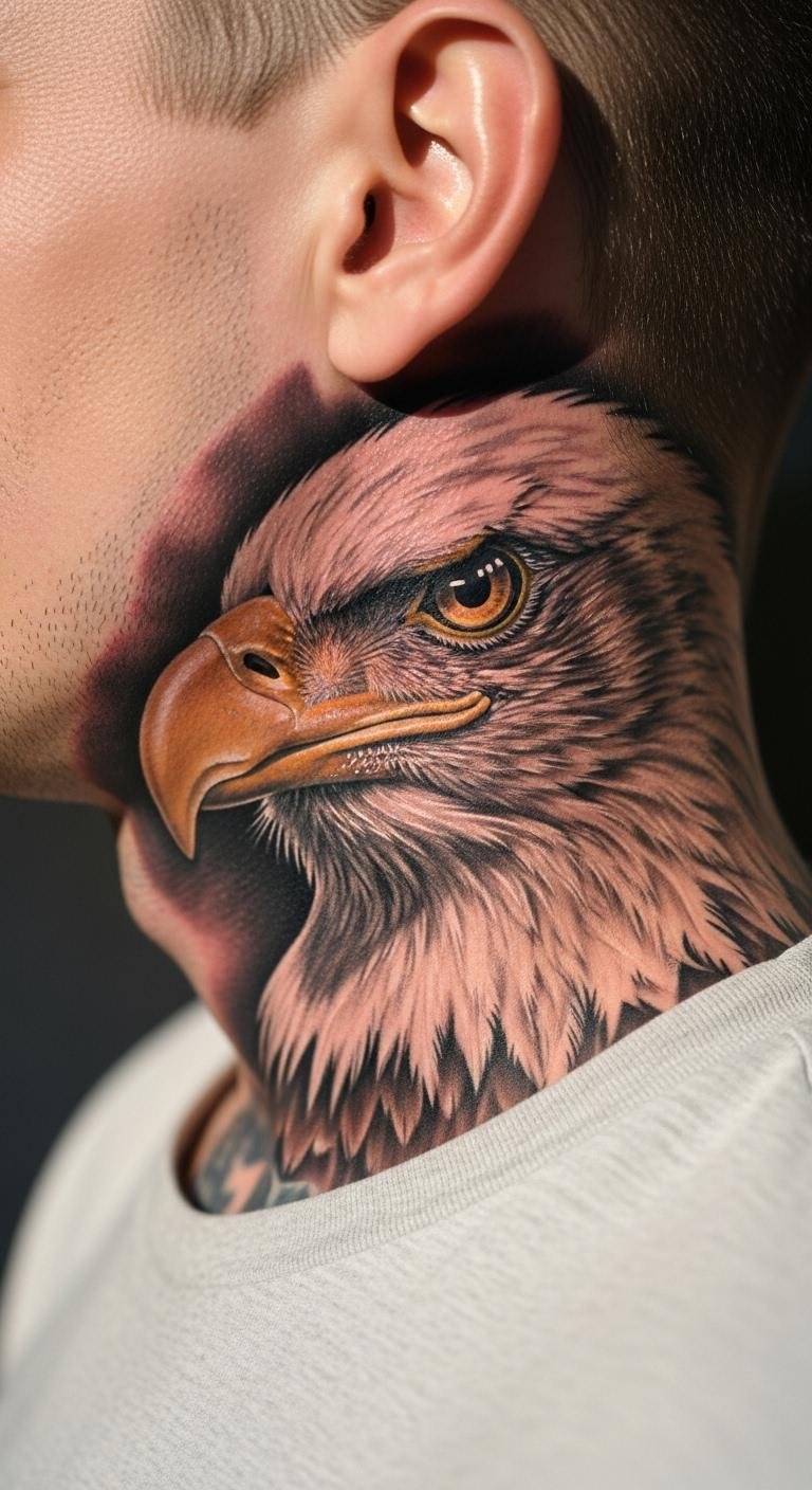 Eagles represent freedom on your neck. Practice by drawing feathers on paper. Grab markers from around the house. This lets you adjust size for your neck. Choose a side placement for balance. Realistic styles need skill, so seek affordable artists online. Use phone apps to edit photos of your neck for previews. After, protect it with sunscreen you own. Keep designs moderate to avoid high costs. The eagle adds depth and story to your look. You’ll feel empowered with this choice.