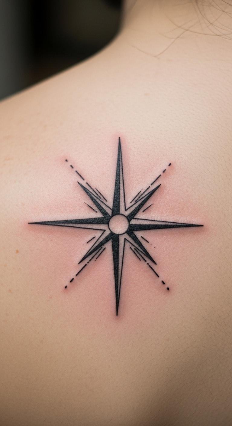 Timeless lines in a North Star last forever. It holds your commitments. Sketch enduring shapes. Place on your back. Charge around $75. Use tape for placement. Make it solid. This design stays true. Draw it out first.