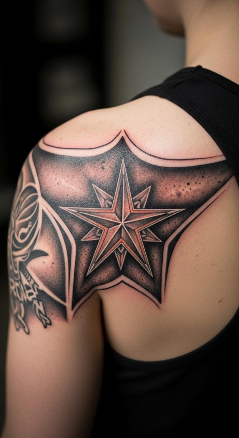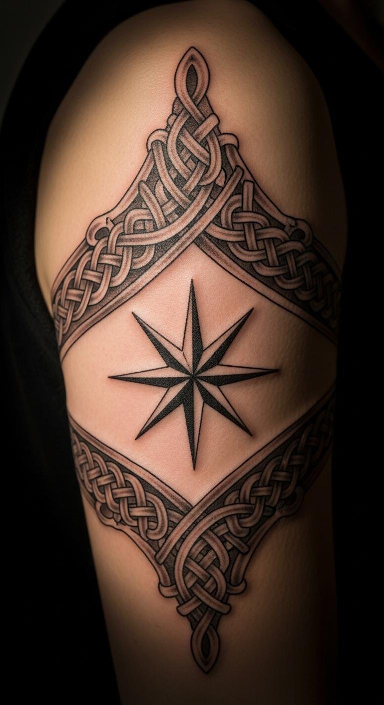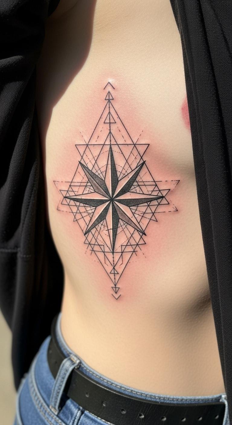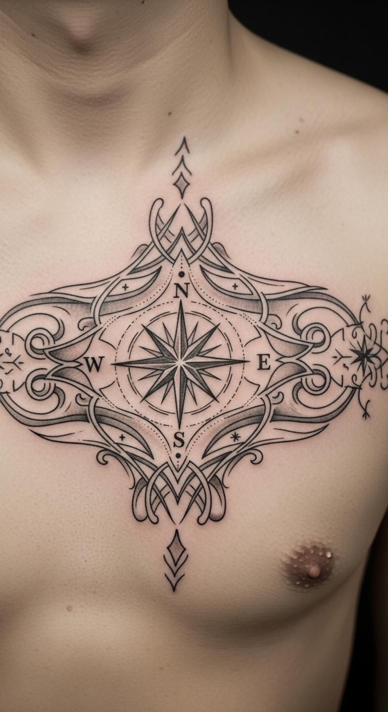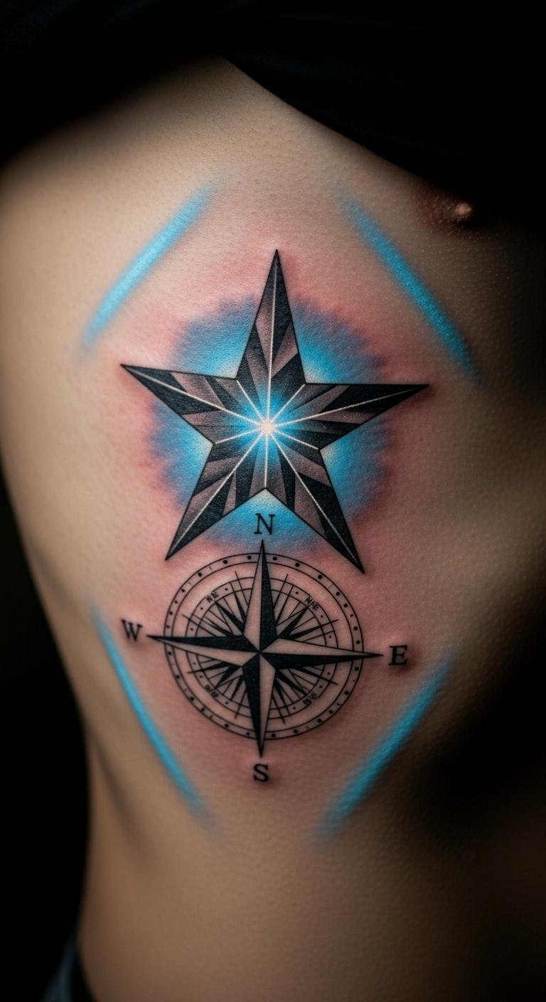 A North Star in a chest piece flows with you. It centers your focus. Draw connected shapes. Put it front. Artists charge $95. Use body mirrors. Keep it linked. This tattoo centers you. Sketch plans.