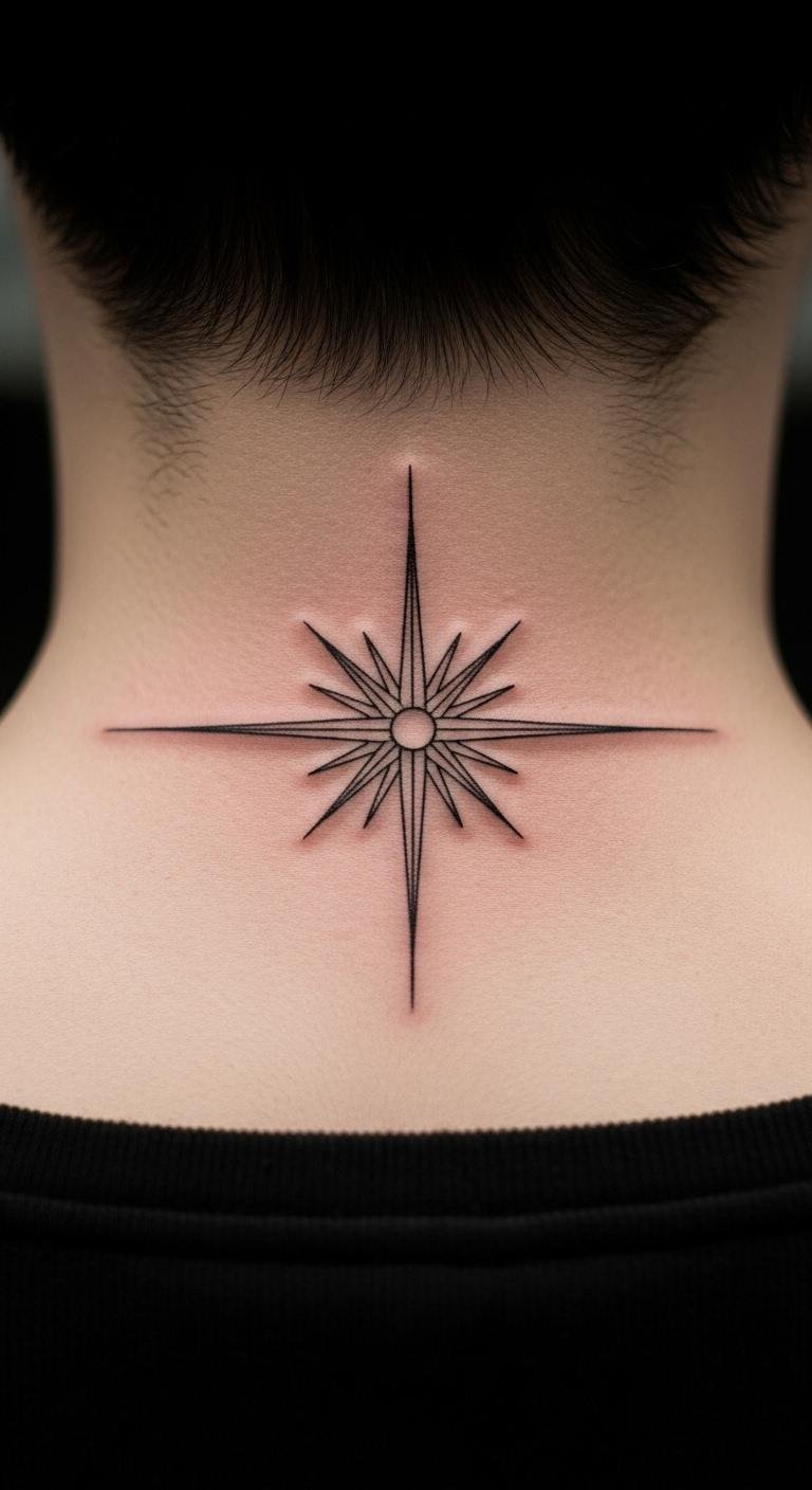 A North Star on your neck stands out. It leads boldly. Draw neat lines. Place high. Expect $65. Use a string guide. Make it sharp. This design shows direction. Try on paper.