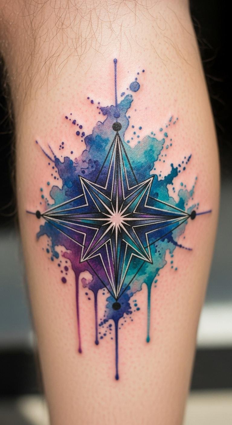 Watercolor North Star brings soft hues. It paints dreams. Mix colors lightly. Place on leg. Artists do for $80. Use paints to preview. Keep it fluid. This design washes in beauty. Sketch fast.