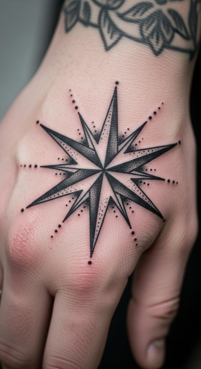 Black and white North Star keeps it classic. It defines clear paths. Sketch in shades. Place on hand. Shops charge $55. Use pens for contrast. Add depth. This design stands firm. Draw it out.