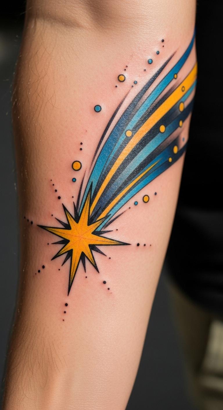 Add color to a shooting star with a North Star center. It sparks hope and movement. Mix paints at home to visualize hues. Place it on your arm for visibility. Artists charge about $70 for colors. Use colored pencils for a quick sketch. Include streaks for a dynamic feel. This tattoo lights up your story. Pick cheap inks if you go colorful. Try fabric markers on cloth to preview. It helps without ink commitment. Keep the design small to save money.