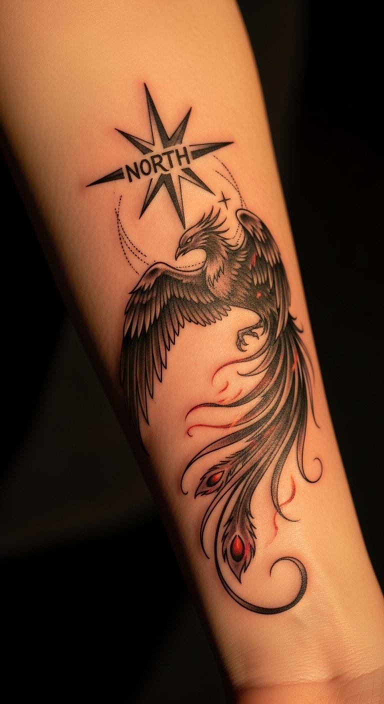 Combine a North Star with a phoenix for rebirth vibes. It shows growth and direction. Draw feathers around the star on paper. Place it on your forearm for impact. Artists offer this for $100. Use crayons to mock it up. Add flames for extra flair. This duo tells a transformation story. Find free templates online. Stick to basic colors to save. Try drawing on fabric first. It previews without cost.