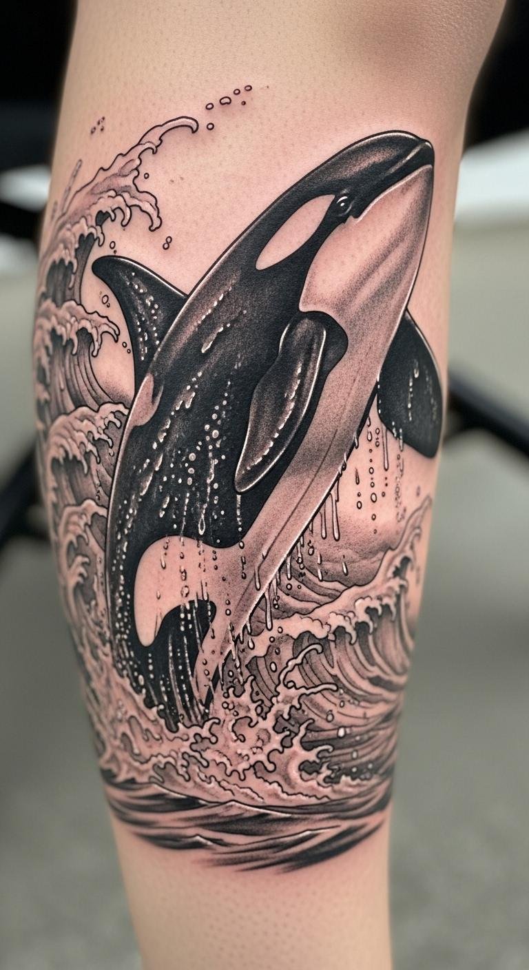 Picture a tattoo that brings the sea to life. This design shows an orca jumping through waves, full of detail. Start with a simple sketch on paper using a black pen. Add waves around it for flow. If you’re on a budget, trace photos online and tweak them yourself. Talk to a local artist for tweaks; many offer free consultations. Keep colors basic with black ink to cut costs. Bold the key: try a home drawing kit first. This idea highlights orca speed and power, perfect for adventure lovers. Get feedback from friends before committing. You’ll end up with art that tells your story without breaking the bank.