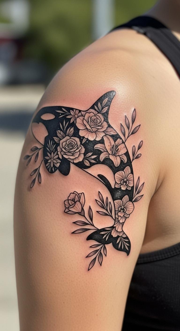 Wrap the orca in flowers for growth and beauty. This mix shows balance. Draw flowers near the whale on paper. Choose simple blooms. Find flower stencils online. Test with flower stamps. Use one ink color for economy. Bold this: add flowers easily. It highlights harmony and life cycles. Share your design for tweaks. This idea makes tattooing creative.