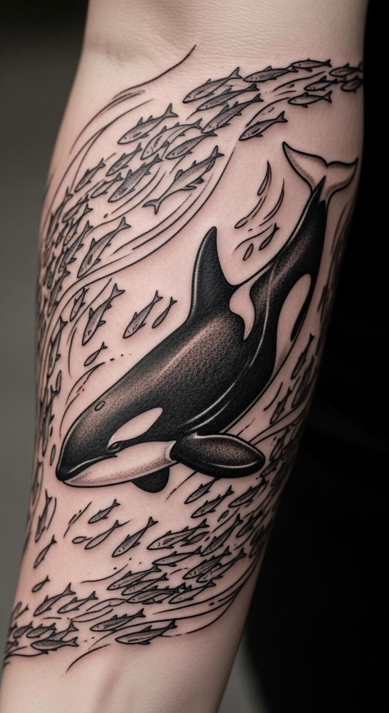 Surround the orca with bubbles for lightness. This design adds joy. Bubble around the silhouette on paper. Vary bubble sizes. Use bubble drawing guides online. Practice on bubble wrap. Keep it sparse for cost. Bold the tip: bubble around simply. It symbolizes freedom and play. Consult for adjustments. This makes tattooing fun.